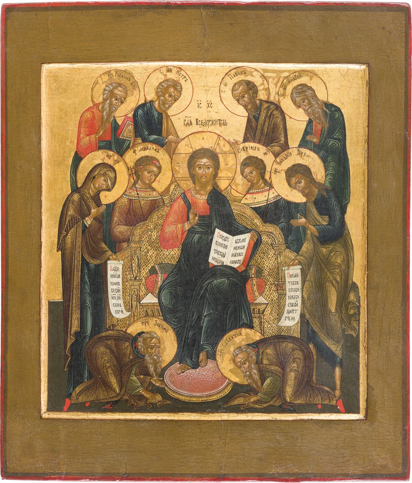 AN ICON SHOWING THE EXTENDED DEISIS Russian, 19th century Tempera on wood panel with kovcheg. Finely executed in great detail on a gold ground. All bearing gilt haloes, painted traditionally with complimentary greens, blues and reds, the garment folds emphasised with strong gold striations. Minor areas of retouching. 35.4 x 30.7 cm.