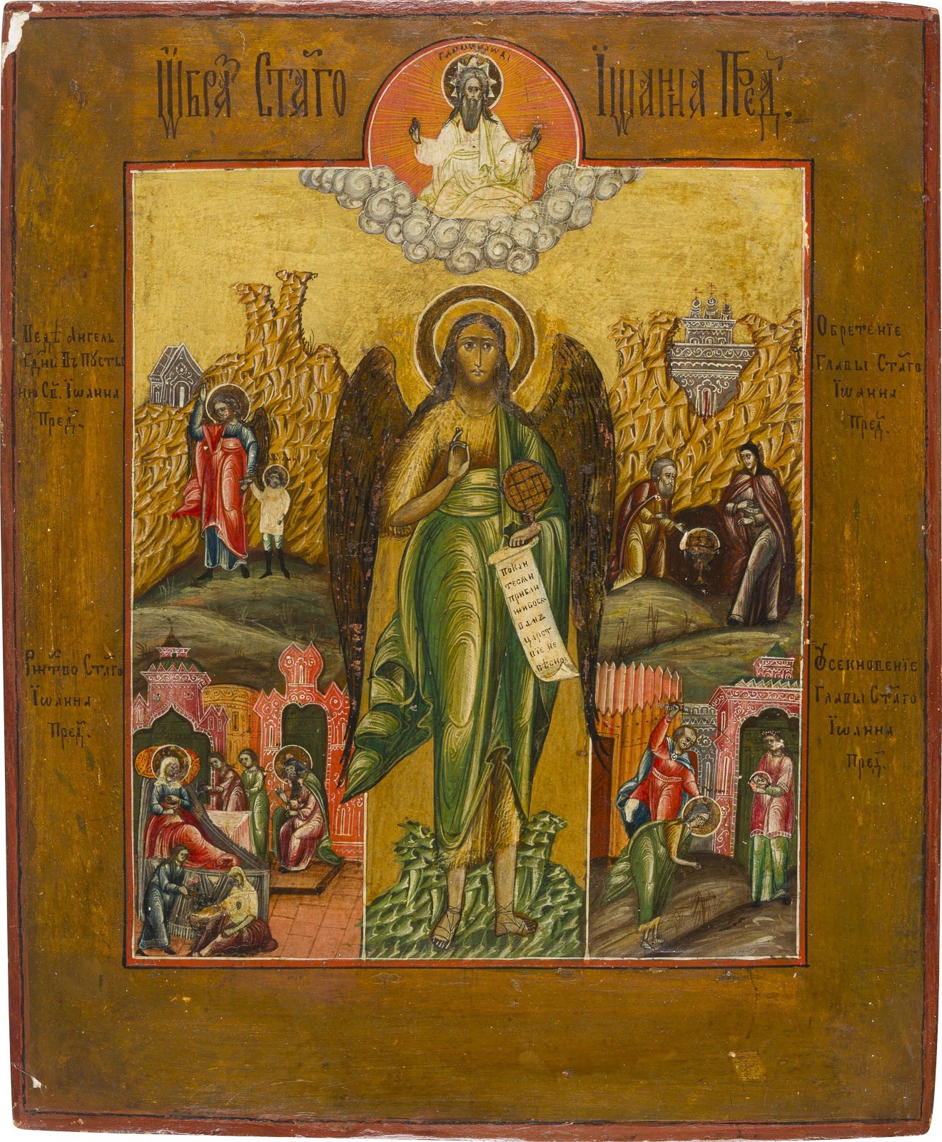 AN ICON OF ST JOHN THE FORERUNNER WITH FOUR SCENES FROM HIS LIFE Russian, 19th century Tempera on wood panel with kovcheg. Restorations. 31 x 25.7 cm.