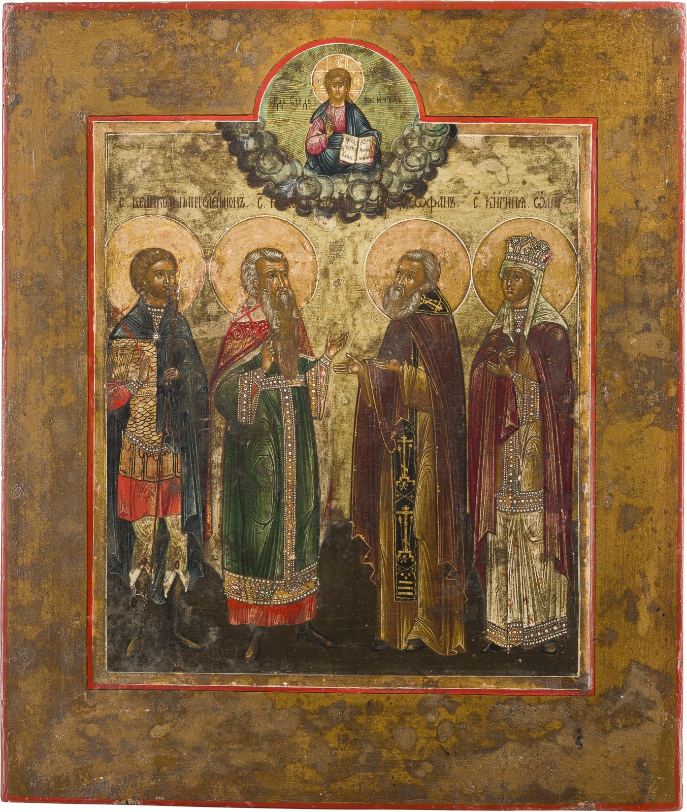 AN ICON SHOWING FOUR SELECTED SAINTS, STS. PANTELEIMON AND OLGA AMONG THEM Russian, 19th century Tempera on wood panel with kovcheg. The haloes made of gold. Partially restored. 30.9 x 26.2 cm.