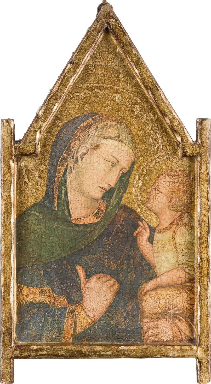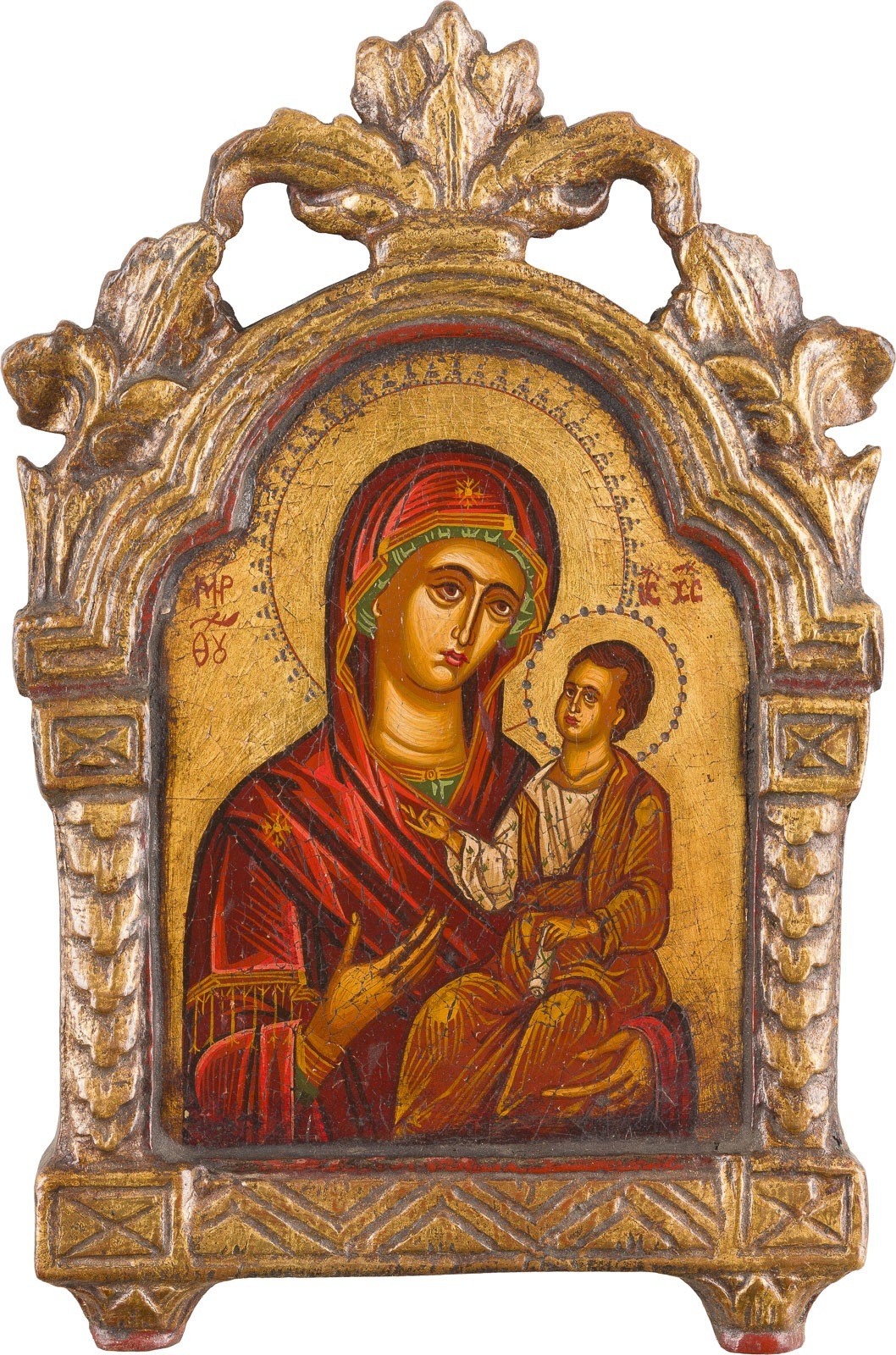 AN ICON AND A PANEL PAINTING PRINT SHOWING THE MOTHER OF GOD Modern period Wood panels, oil on gold ground / offset print. 31 x 20.7 cm / 51 x 28 cm.