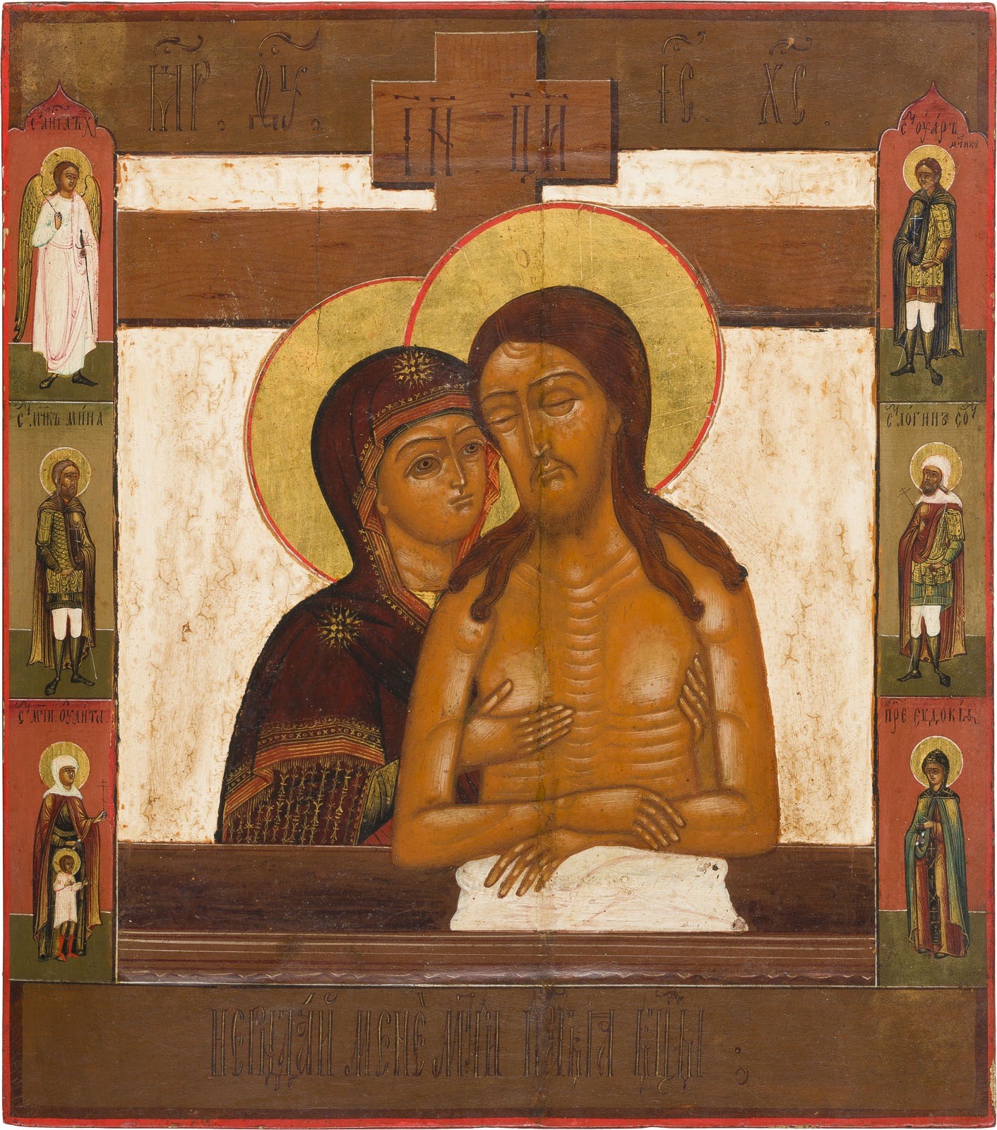 AN ICON 'MOTHER DO NOT WEEP FOR ME' Russian, 19th century Tempera on wood panel with kovcheg. The haloes made of gold. Six patron saints represented on the border, the Guardian Angel, Sts. Menas and Yulitta among them. The background stripped to gesso, vertical crack minimally restored. 29.6 x 26.1 cm.