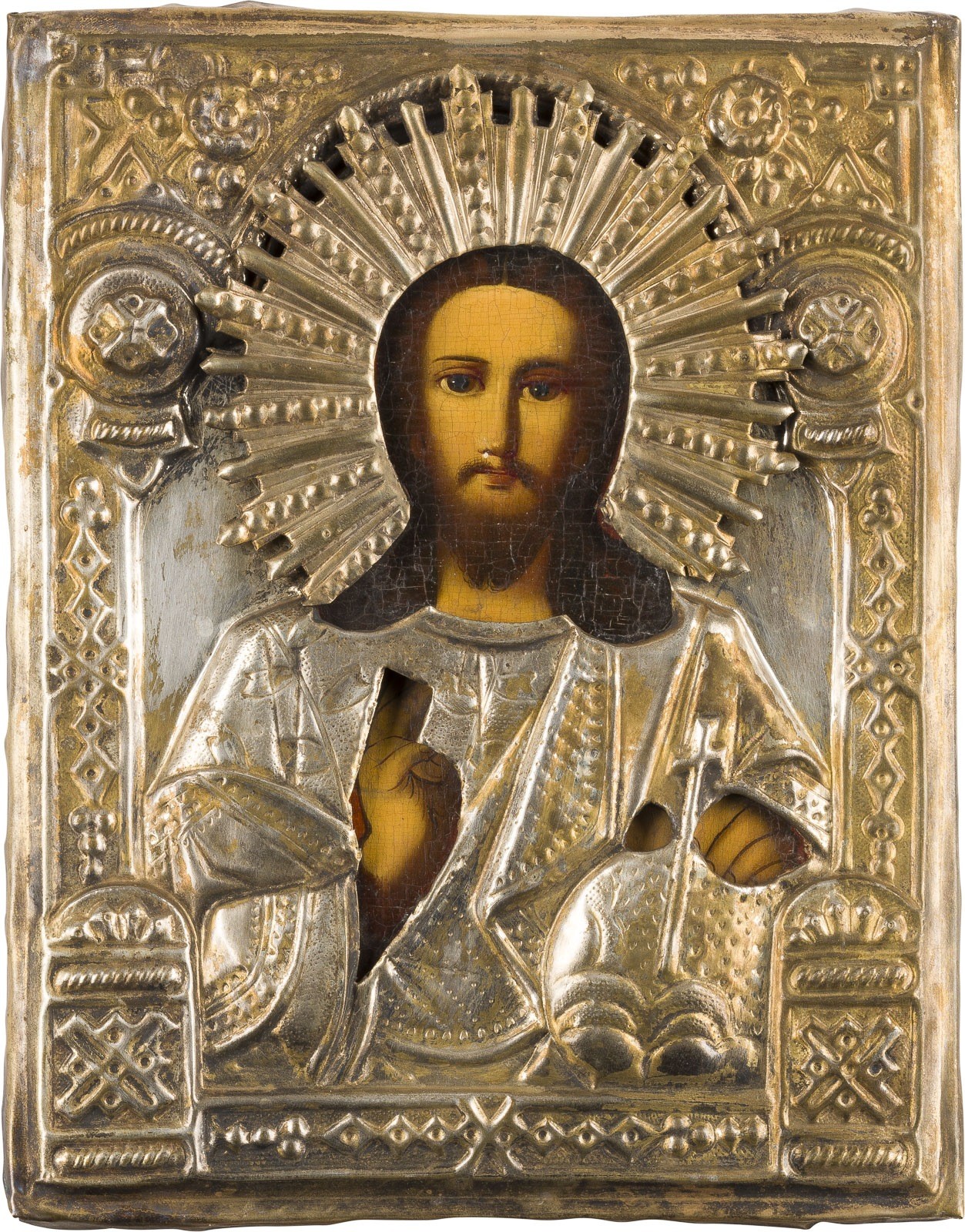 A SMALL ICON SHOWING CHRIST THE SAVIOUR WITH OKLAD Russian, 19th century Oil on wood panel. The brass oklad chased and repoussé. 22.2 x 17.4 cm.