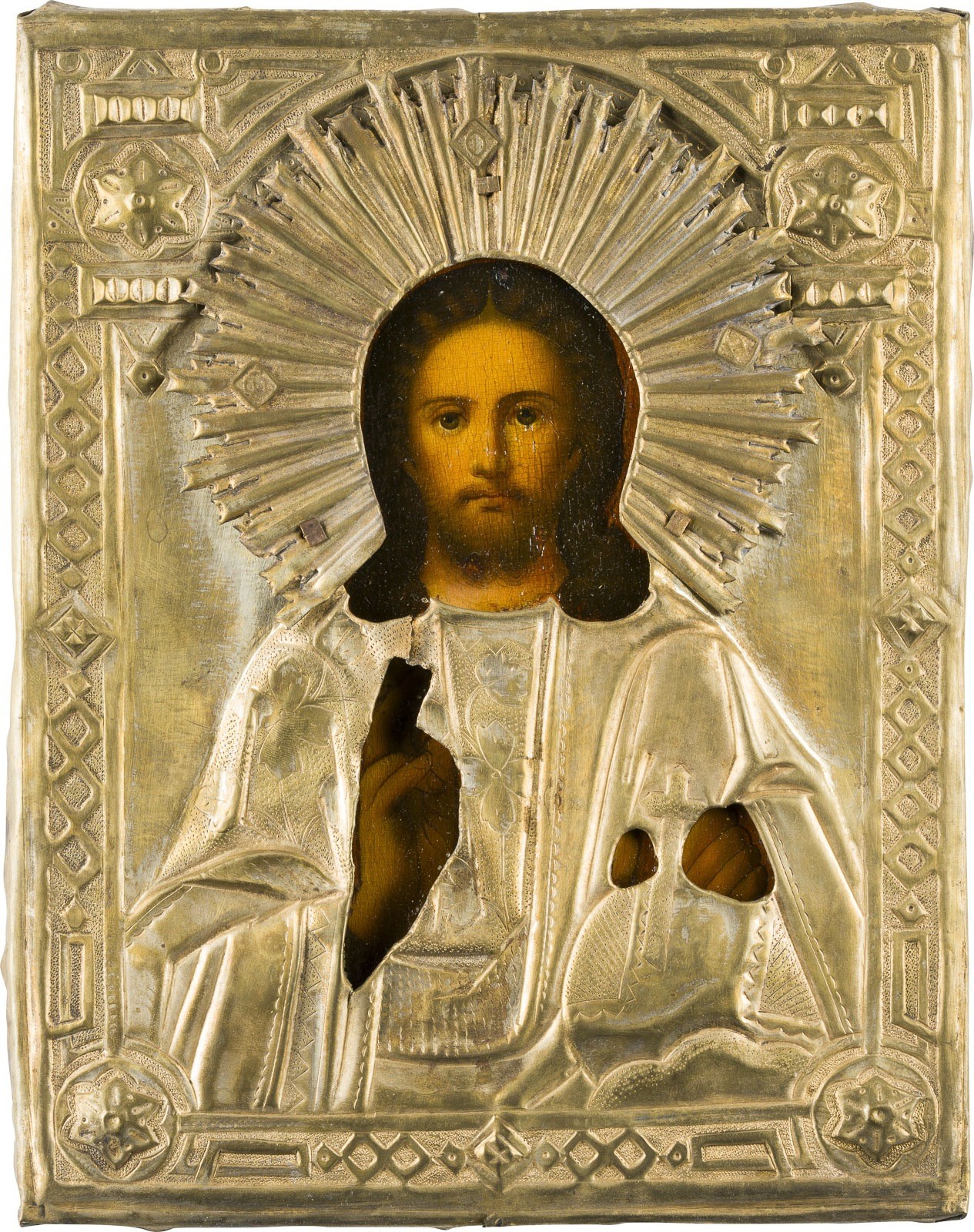 A SMALL ICON SHOWING CHRIST THE SAVIOUR WITH OKLAD Russian, mid 19th century Oil on wood panel. The brass oklad chased and repoussé. Minimally restored. 22.5 x 18.2 cm.