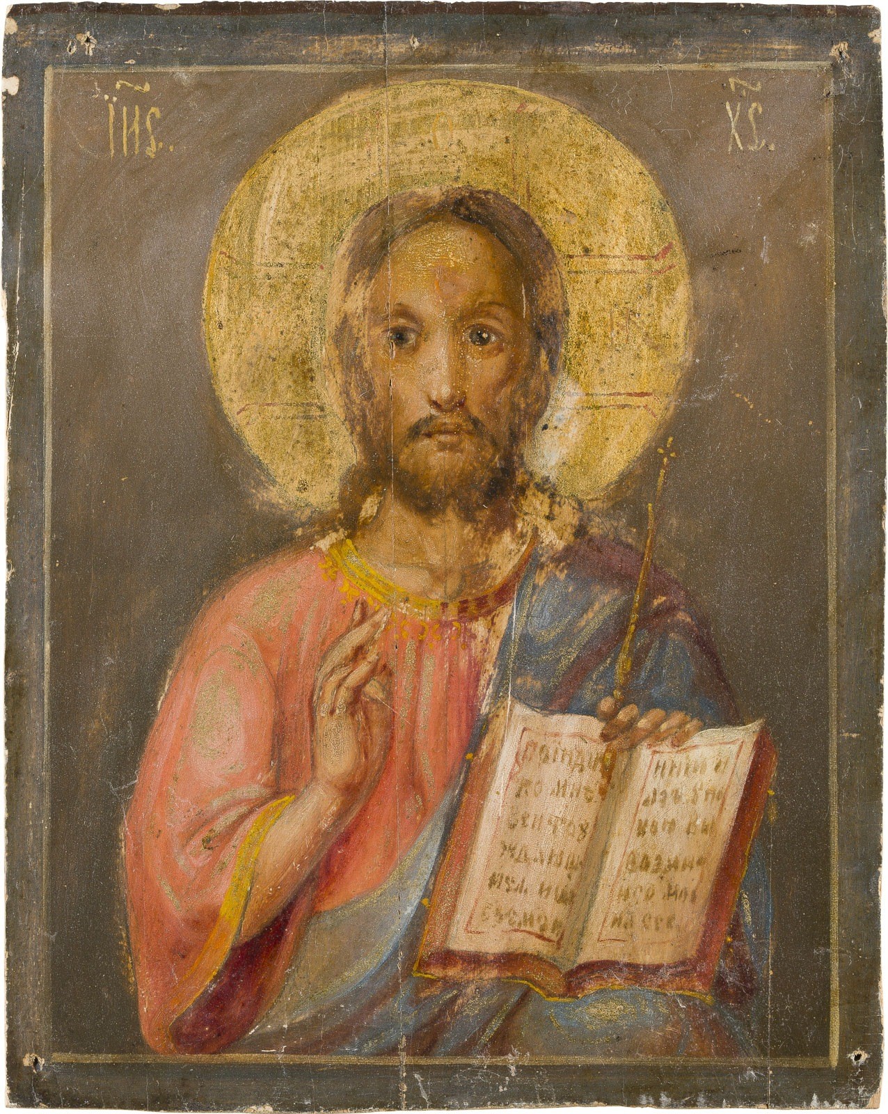 A SMALL ICON SHOWING CHRIST PANTOKRATOR Russian, 19th century Oil on wood panel. The halo made of gold. Wearings, minimally restored. 22.2 x 17.8 cm.