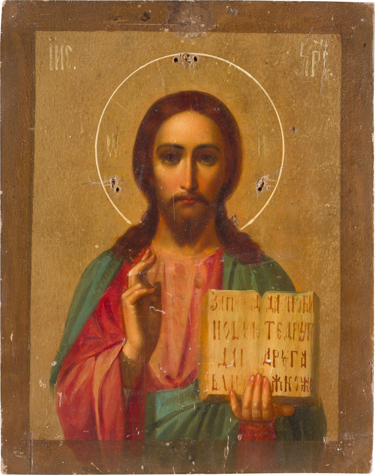 A SMALL ICON SHOWING CHRIST PANTOKRATOR Russian, circa 1900 Oil on wood panel with silk backing. Nail holes. 22 x 17.5 cm.