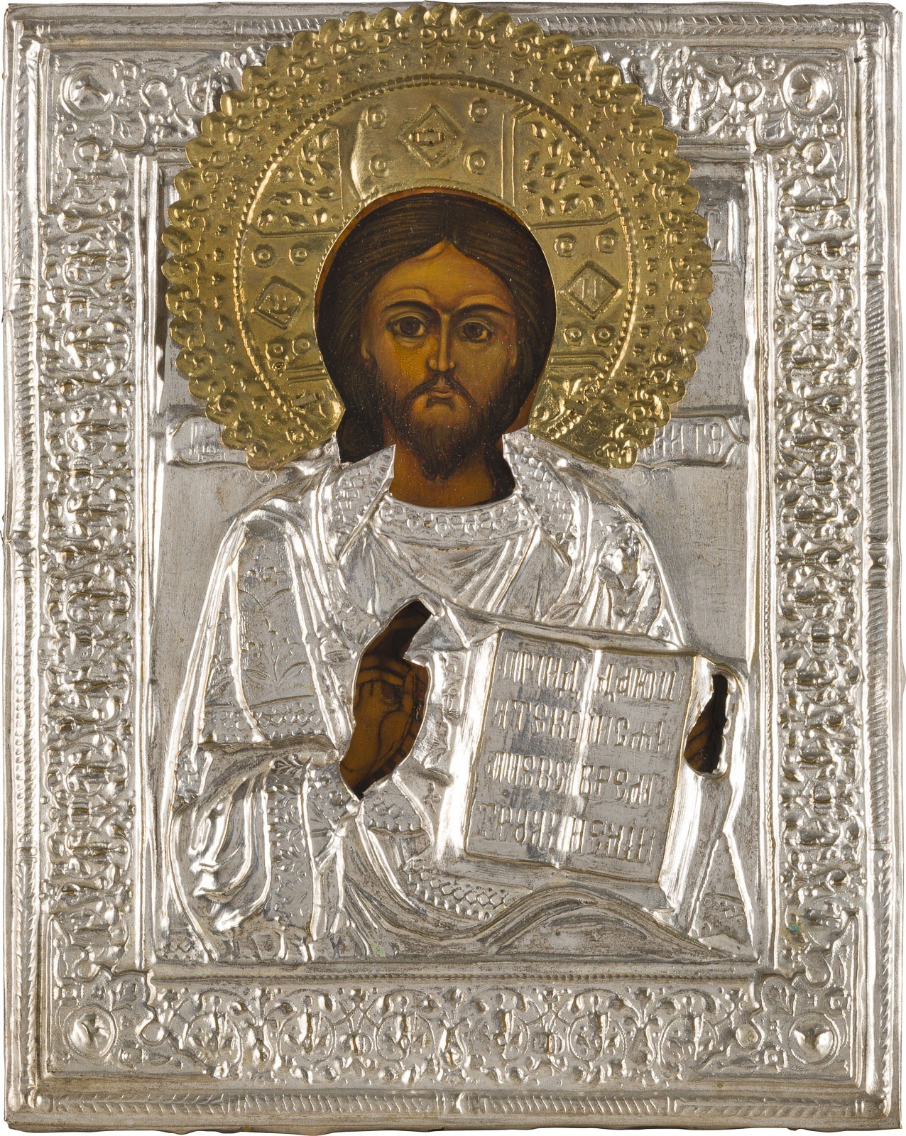 A SMALL ICON SHOWING CHRIST PANTOKRATOR WITH OKLAD Russian, late 19th century Tempera on wood panel. The metal oklad decorated with hammered foliate borders. Repainted recently. 22 x 17.5 cm.
