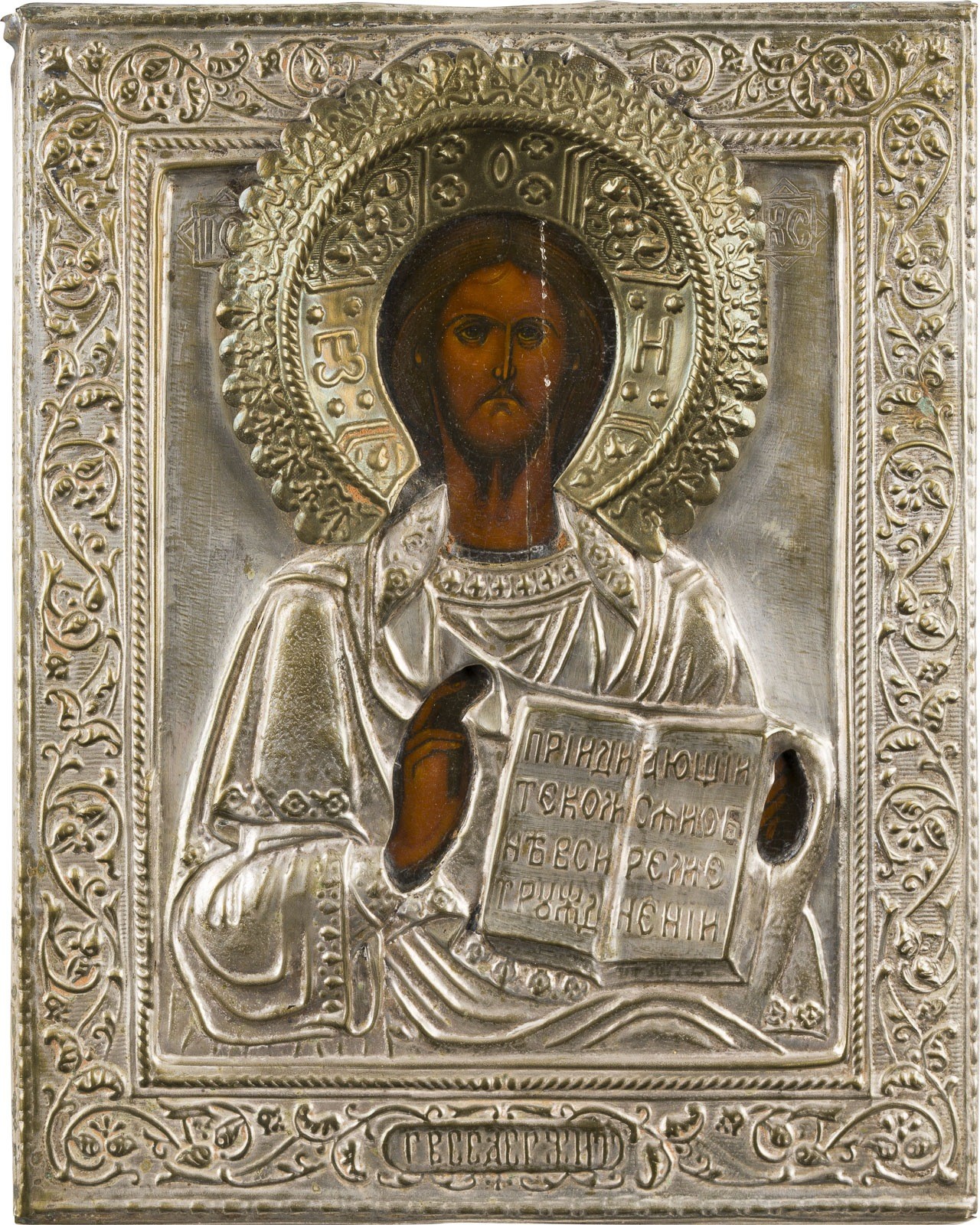 A SMALL ICON SHOWING CHRIST PANTOKRATOR WITH OKLAD Russian, late 19th century Tempera on wood panel. The brass oklad chased and repoussé. Vertical cracks. 22.1 x 17.3 cm.