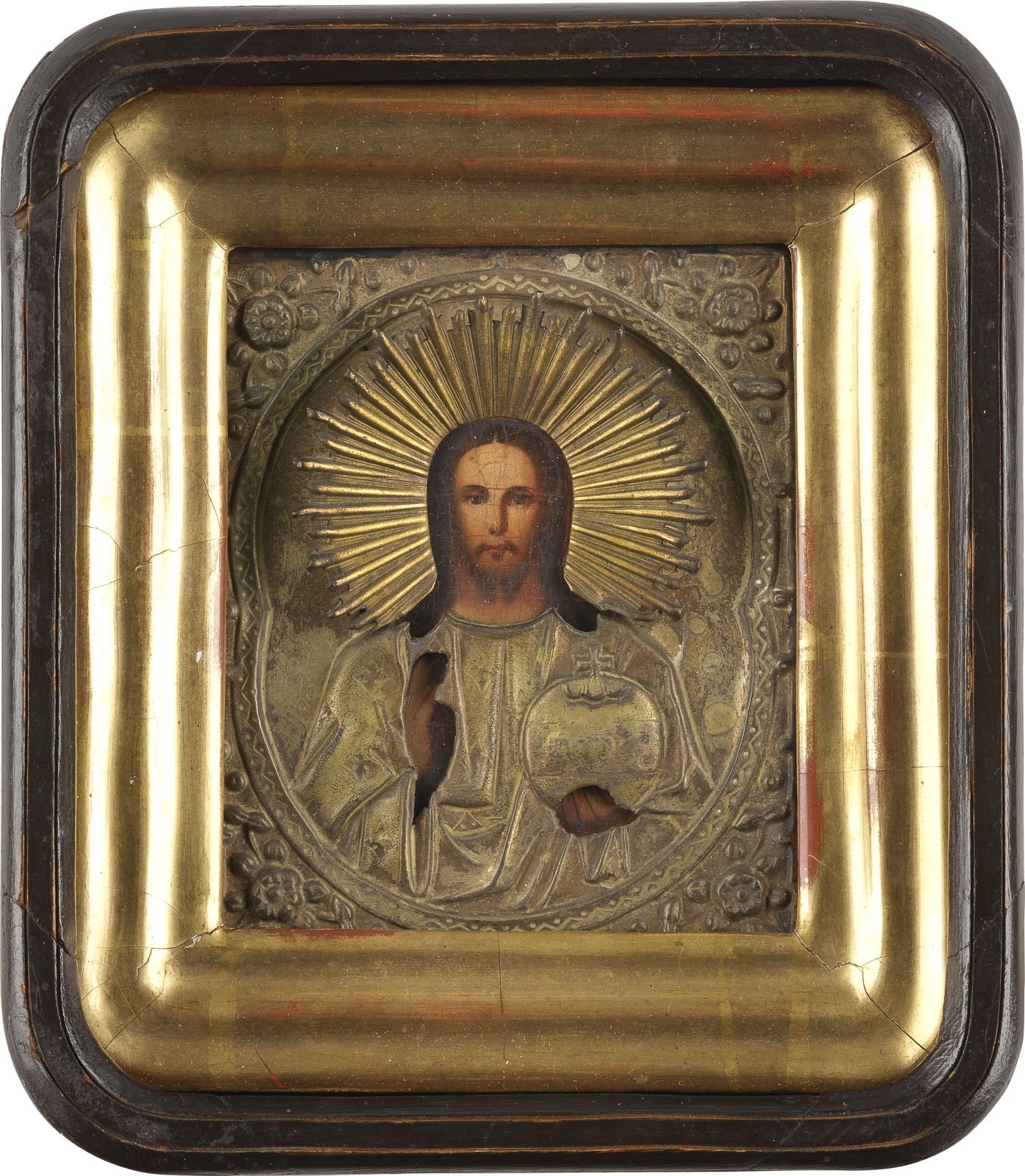 A SMALL ICON SHOWING CHRIST PANTOKRATOR WITH OKLAD WITHIN KYOT Russian, 19th century Oil on wood panel. Overlaid with a chased brass oklad. 20.5 x 18 cm (with kyot).
