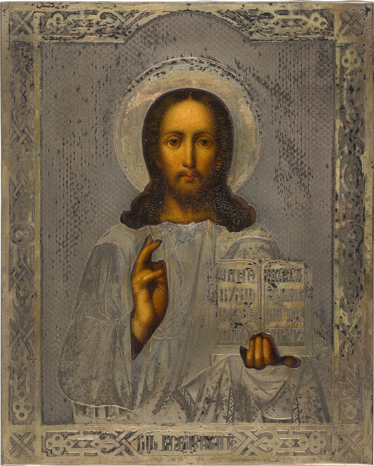 A SMALL ICON SHOWING CHRIST PANTOKRATOR WITH A SILVER PARCEL-GILT OKLAD Russian, circa 1878 (icon), Russian, Moscow, 1878 (oklad) Oil on wood panel with velvet backing. Marked with city hallmark, assayer's mark, 84 standard and master's mark 'I.S.E.' in Cyrillic. 17.6 x 14.2 cm.