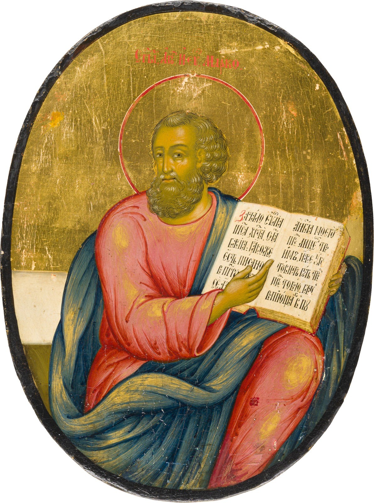 A SMALL ICON SHOWING ST. MARK THE EVANGELIST Russian, 18th century Tempera on wood panel. Finely painted in great detail on a gold ground. Minor areas of retouching. 25 x 18.8 cm.