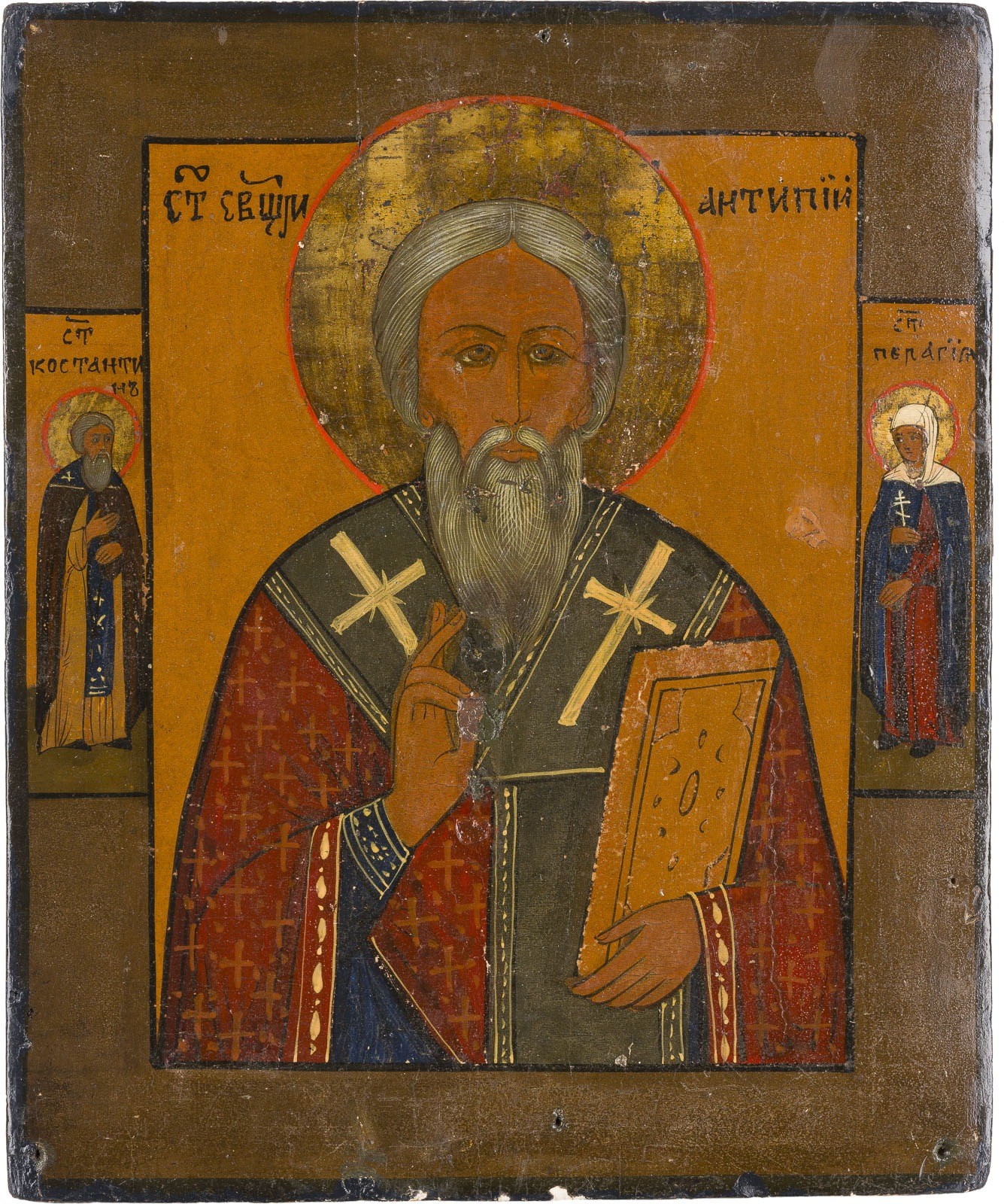 A SMALL ICON SHOWING ST. ANTIPAS Russian, 19th century Tempera on wood panel. The haloes made of silver, covered by a golden lacquer. Two selected saints on the borders: a monk saint and St. Pelagia. Minor losses. 26.4 x 22 cm.