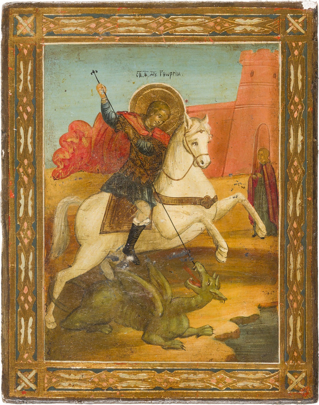 A SMALL ICON SHOWING ST. GEORGE KILLING THE DRAGON Russian, 19th century Tempera on wood panel. The halo and border made of gold and incised with strapwork. The edges minimally chipped. 18.8 x 14.8 cm.