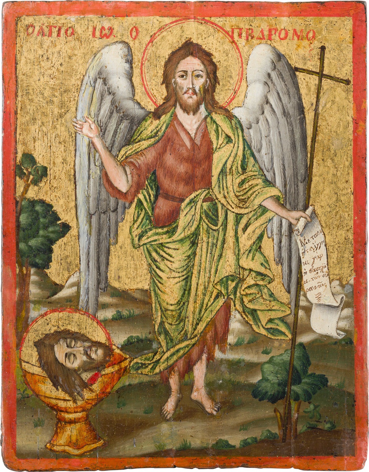 A SMALL ICON SHOWING ST. JOHN THE FORERUNNER Greek, 19th century Tempera on wood panel. The Forerunner depicted standing against a gilded ground, wearing a hair shirt, holding an unfurled scroll and gesturing towards a chalice. Partially restored. 25.6 x 20.2 cm.