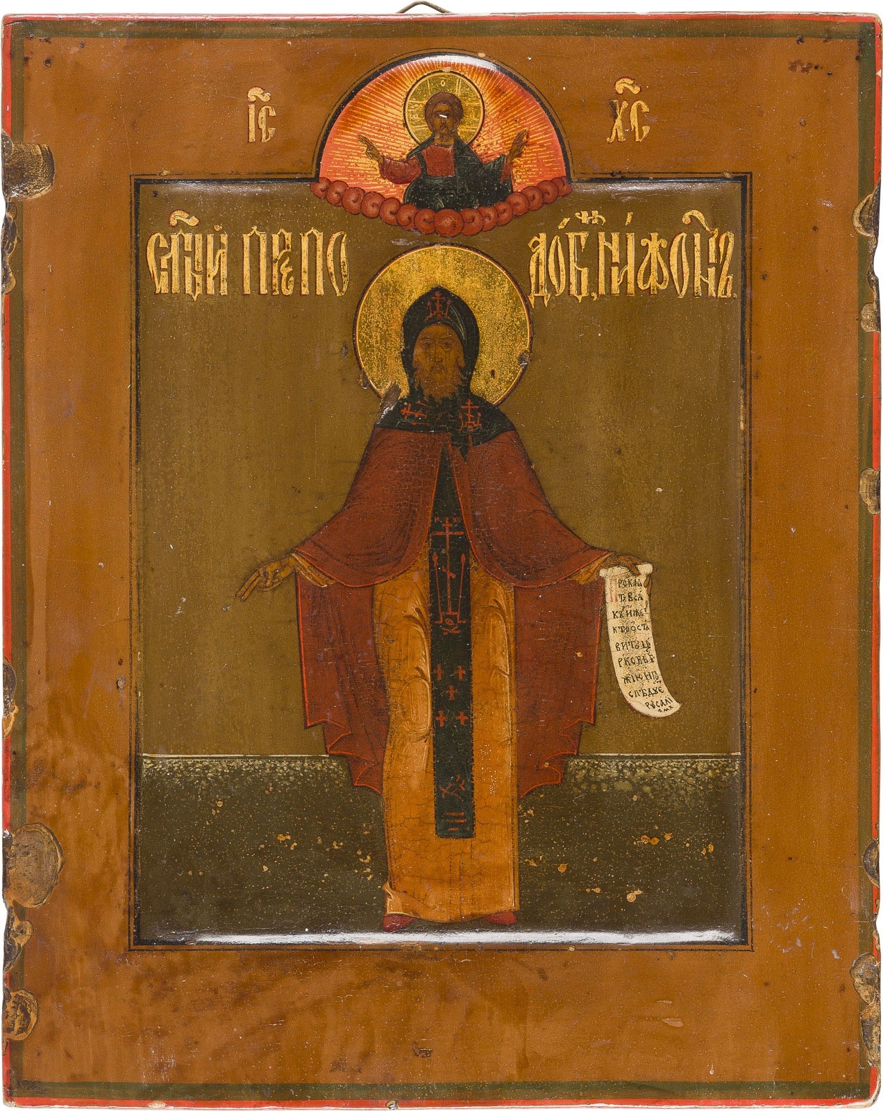 A SMALL ICON SHOWING ST. NIPHONT Russian, 19th century Tempera on wood panel with kovcheg. The haloes made of gold. The edges minimally chipped. 22 x 17.7 cm.