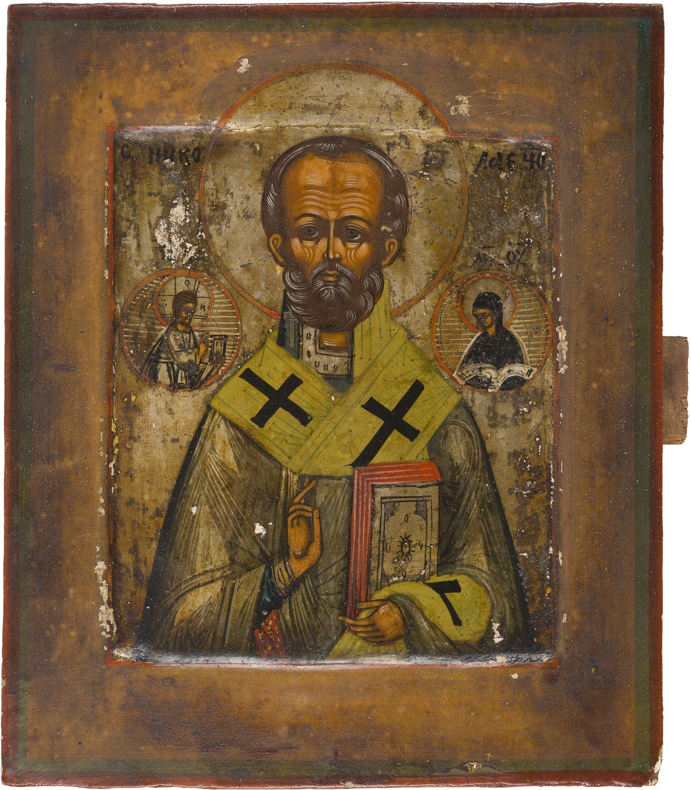 A SMALL ICON SHOWING ST. NICHOLAS OF MYRA Russian, 19th century Tempera on wood panel with kovcheg. The background made of silver, covered by a golden lacquer. Minimally restored. 17.3 x 14.5 cm.
