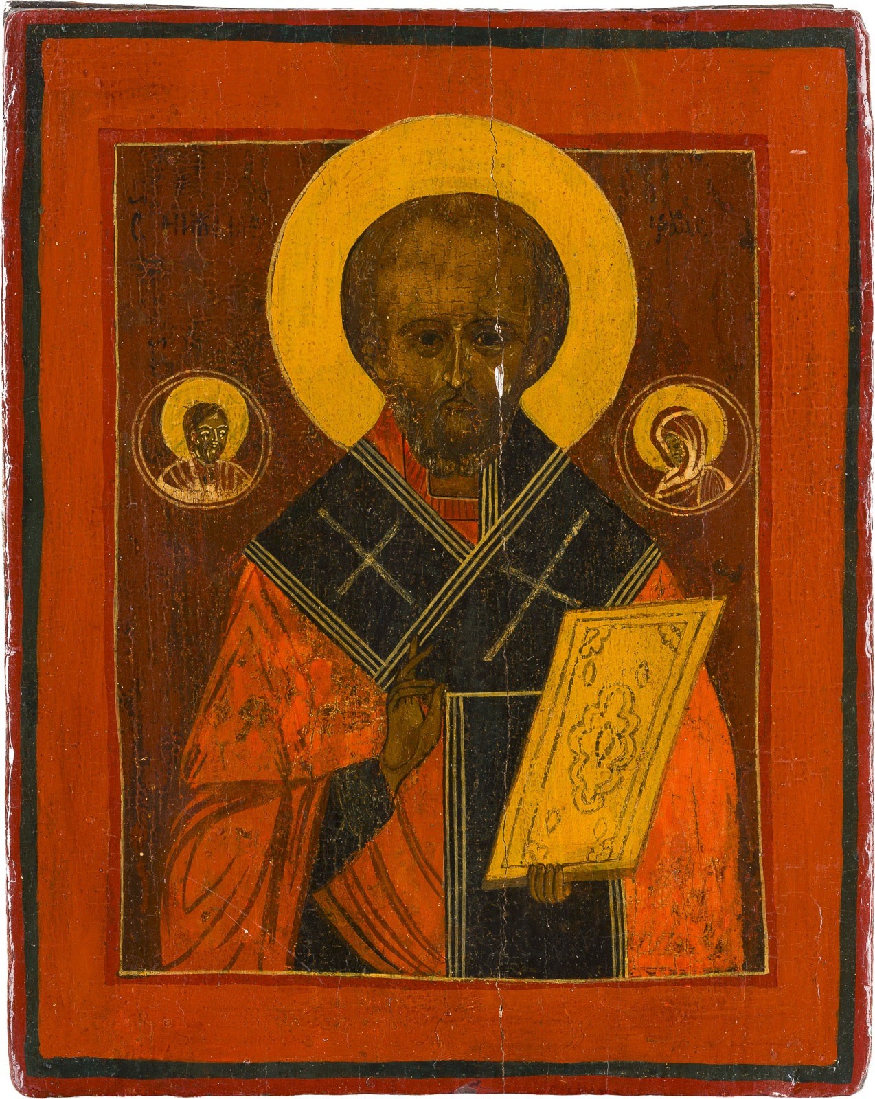A SMALL ICON SHOWING ST. NICHOLAS OF MYRA Russian, 19th century Tempera on wood panel. Minor vertical crack, partially restored. 27.5 x 22 cm.