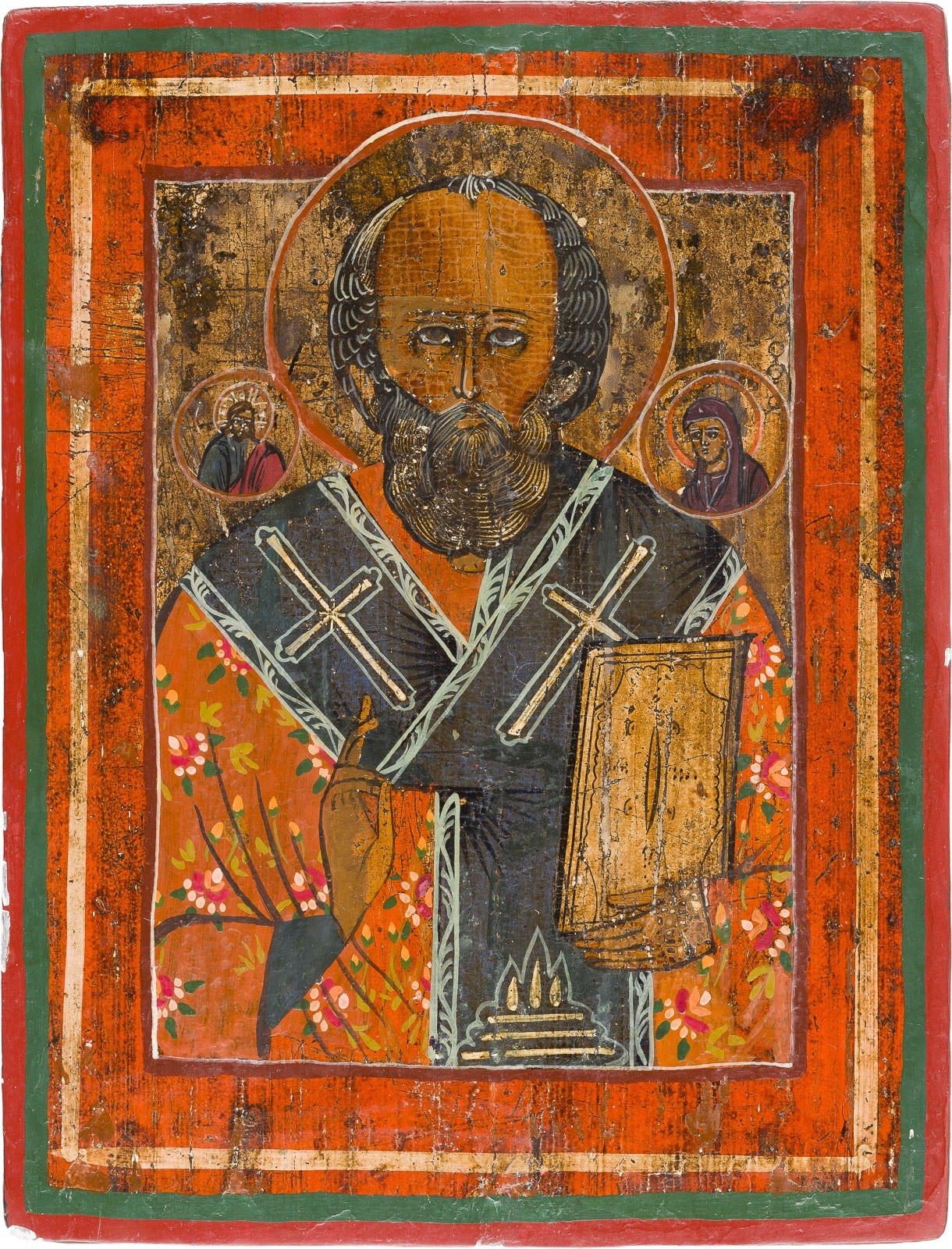 A SMALL ICON SHOWING ST. NICHOLAS OF MYRA Russian, 19th/20th century Tempera on wood panel. Extensively restored and repainted in the recent decades. 28.1 x 21.6 cm.