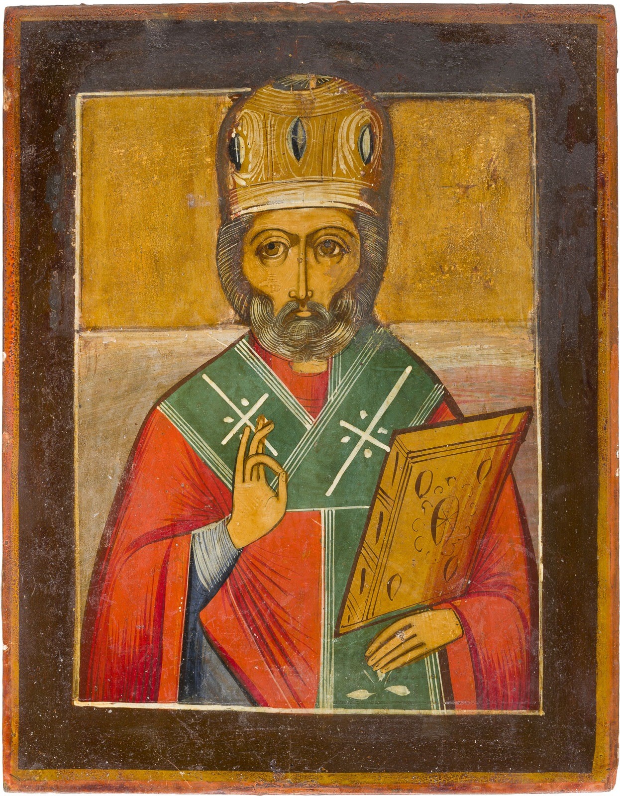 A SMALL ICON SHOWING ST. NICHOLAS OF MYRA Russian, mid 19th century Tempera on wood panel. The background made of silver, covered by a golden lacquer. Partially restored. 27.8 x 21.9 cm.