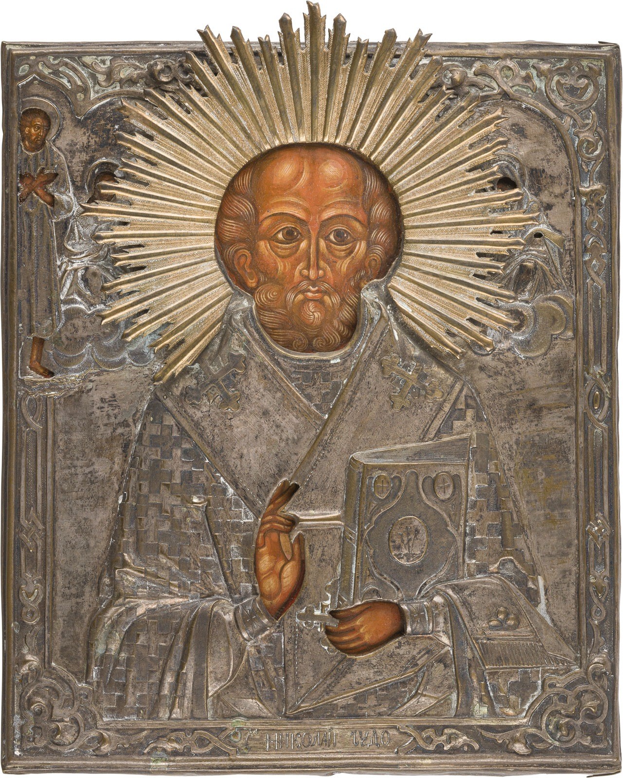 A SMALL ICON SHOWING ST. NICHOLAS OF MYRA WITH OKLAD Russian, mid 19th century Tempera on wood panel. On the left border appears St. Alexis, Man of God. Overlaid with a chased brass oklad. Restored. 27 x 22.5 cm.