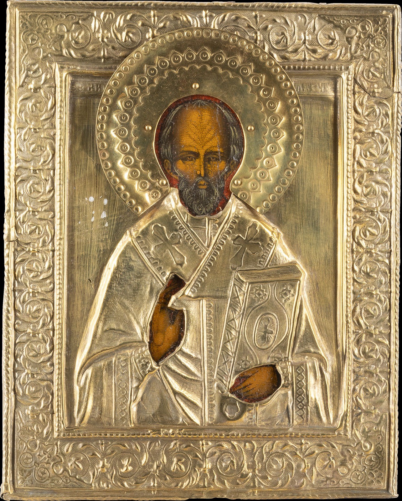 A SMALL ICON SHOWING ST. NICHOLAS OF MYRA WITH OKLAD Russian, late 19th century Tempera on wood panel. Overlaid with a chased brass oklad. 17.5 x 14 cm.