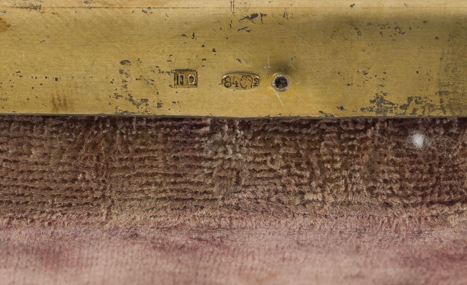 A SMALL ICON SHOWING ST. PANTELEIMON WITH SILVER-GILT AND CLOISONNÉ ENAMEL RIZA Russian, circa 1900 (icon), Russian, Moscow, 1896-1908 (riza) Tempera on wood panel. The background and border gilded and incised to resemble a chased gilded silver oklad. With vari-coloured enamel halo and borders decorated with flowers, foliate scrolls, the borders set with red and white enamel stylized flowers. Marked with assayer's mark, 84 standard and master's mark 'PO' in Cyrillic. 11.8 x 9.5 cm.