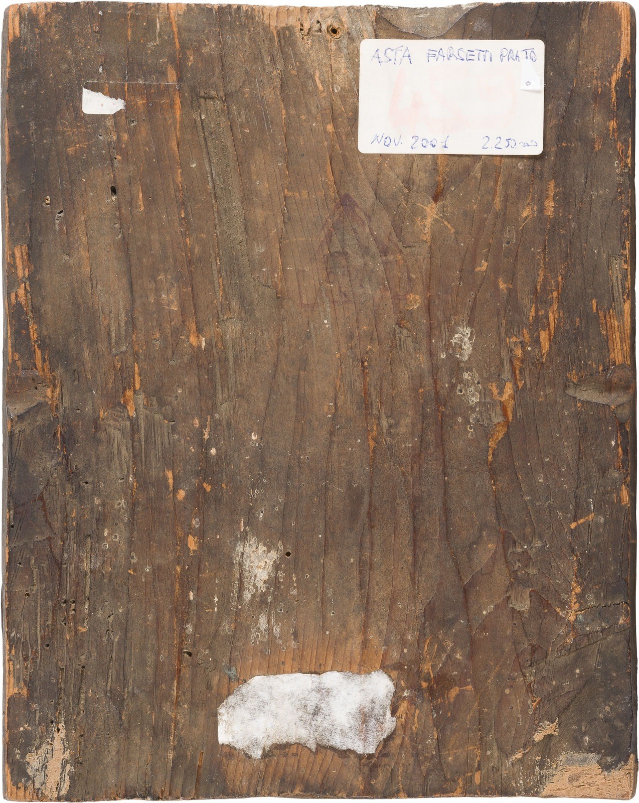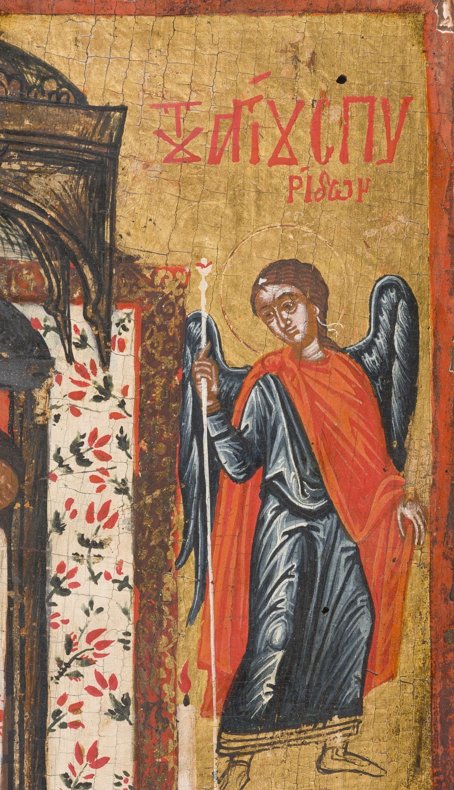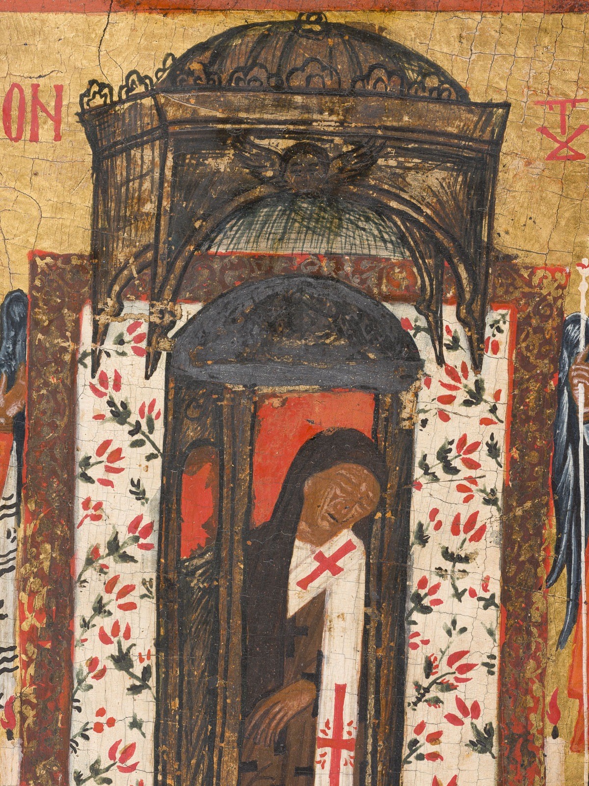 A SMALL ICON SHOWING ST. SPIRIDON OF CORFU Greek, Corfu, circa 1700 Tempera on wood panel. Finely executed on a gold ground. The saint depicted within his elaborate reliquary. The borders partially restored. 24.5 x 19.9 cm.