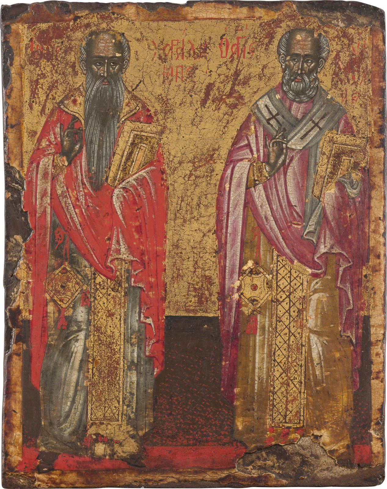 A SMALL ICON SHOWING STS. HARALAMBOS AND NICHOLAS OF MYRA Greek, Cretan, 17th century Tempera on wood panel. Finely painted in great detail on a gold ground. Losses to the borders. 18.5 x 14.8 cm.