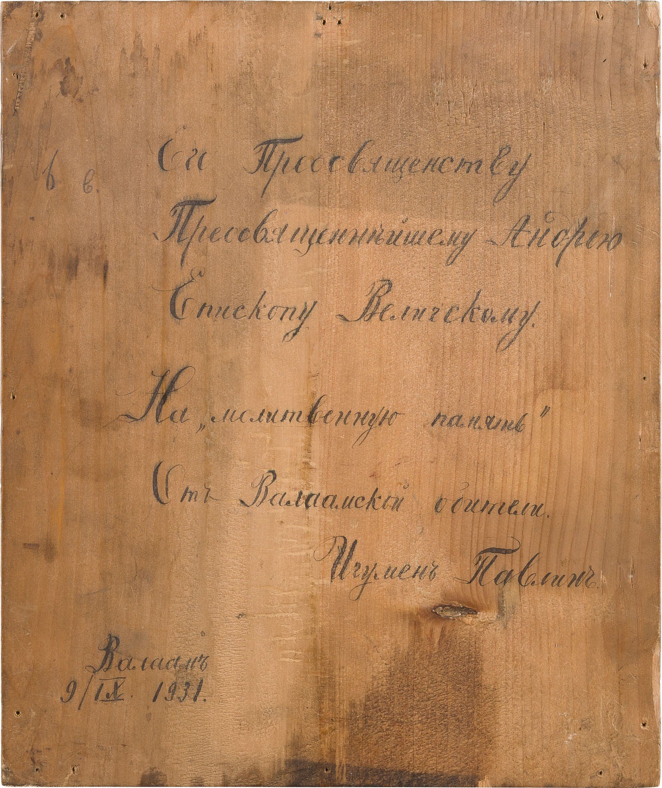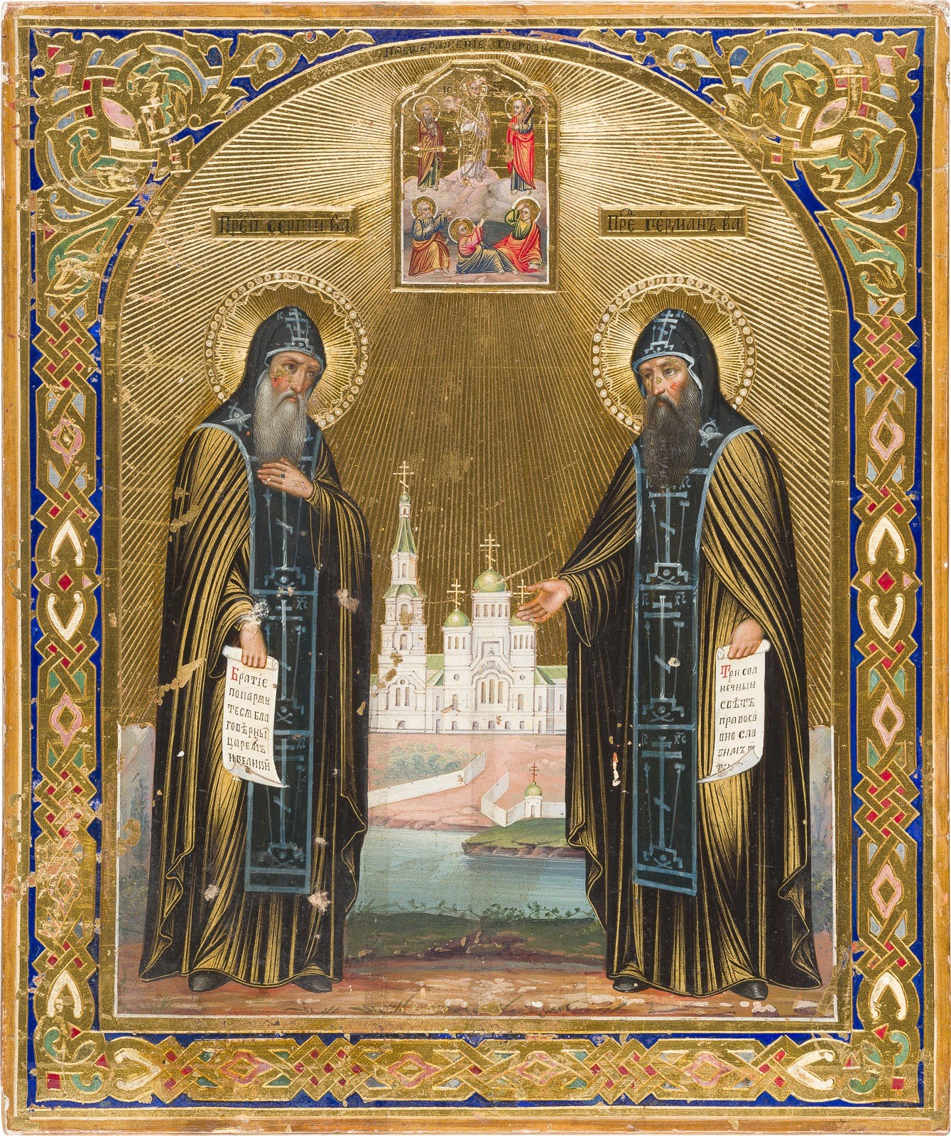 AN ICON SHOWING THE FOUNDERS OF THE VALAAM MONASTERY SERGEY AND GERMAN Russian, circa 1900 Tempera on wood panel. The gilt background ornately incised. The borders ornately incised and painted in faux enameling. On the reverse Cyrillic dedication inscription, dated '1931'. 26.4 x 22 cm.