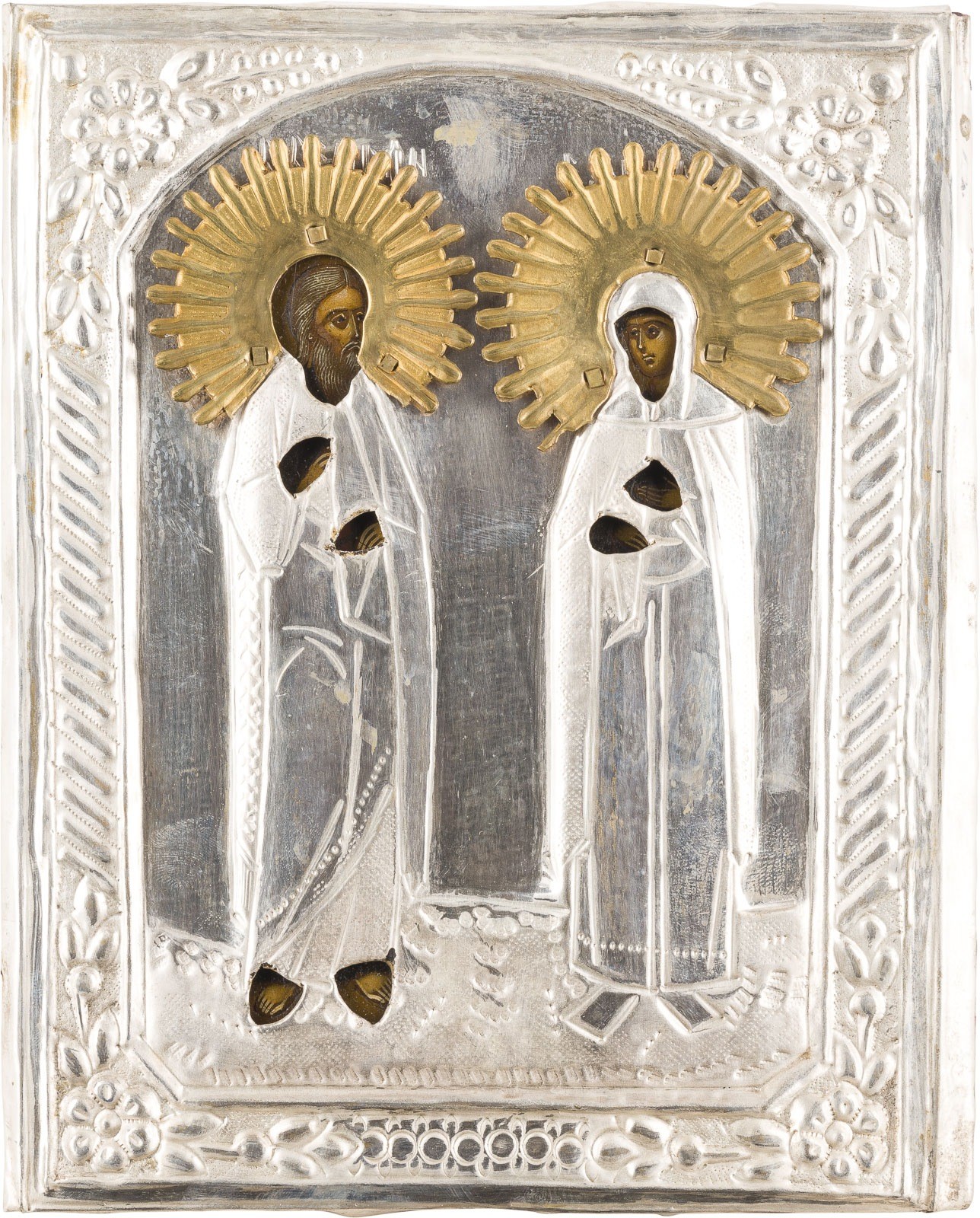 A SMALL ICON SHOWING STS. SYMEON AND ANNE WITH OKLAD Russian, late 19th century Tempera on wood panel. Overlaid with a chased metal oklad. 22 x 17.7 cm.