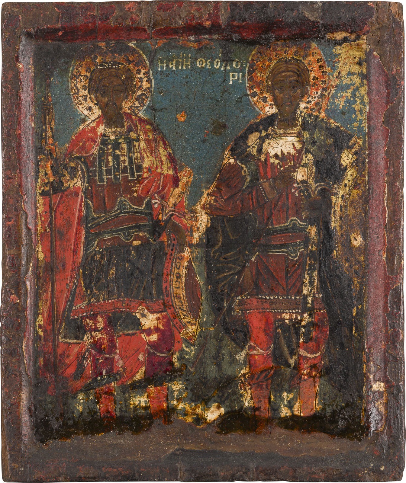 A SMALL ICON SHOWING STS. THEODORE TYRON AND THEODORE STRATELATES Greek, early 18th century Tempera on wood panel with kovcheg. The garments with gold highlights. Losses, the lower border restored. 22.3 x 18.7 cm.