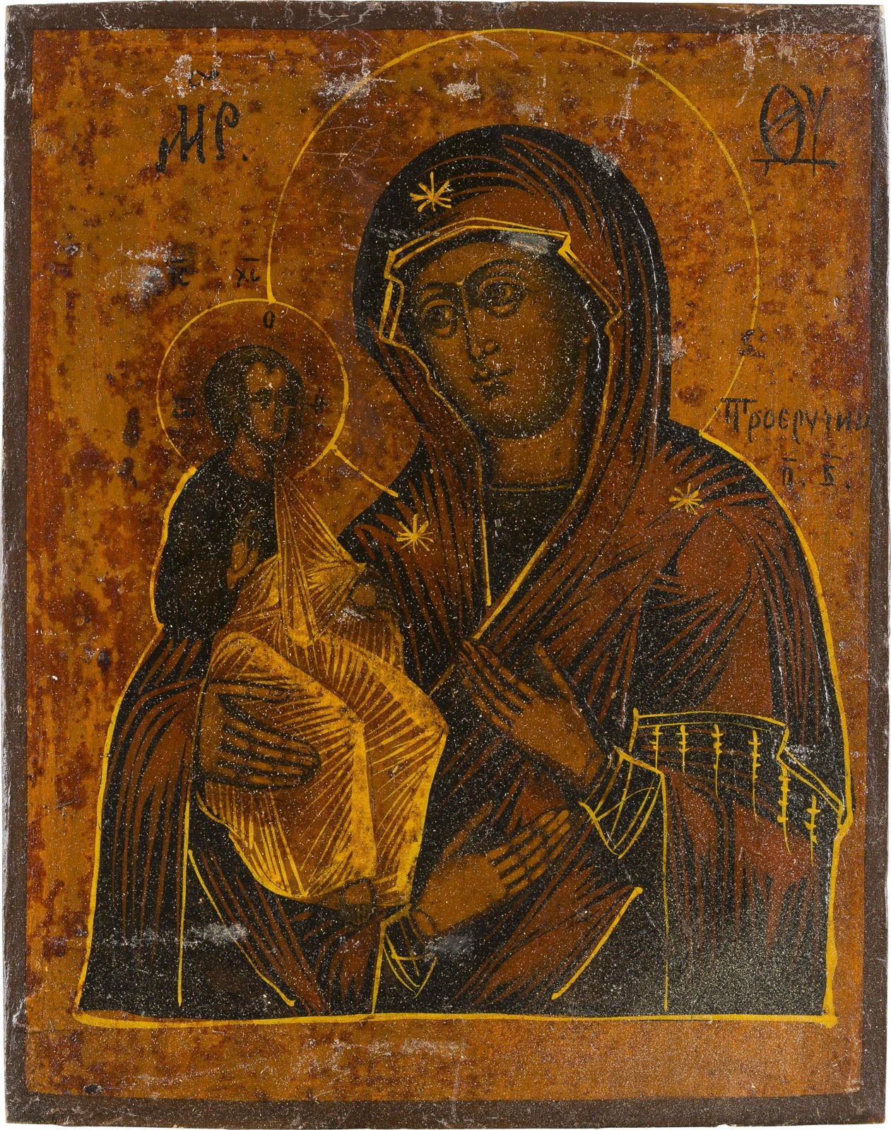 A SMALL ICON SHOWING THE THREE-HANDED MOTHER OF GOD WITH OKLAD Russian, mid 19th century Tempera on wood panel. The brass oklad chased and repoussé. Partially restored. 21.7 x 17.5 cm.