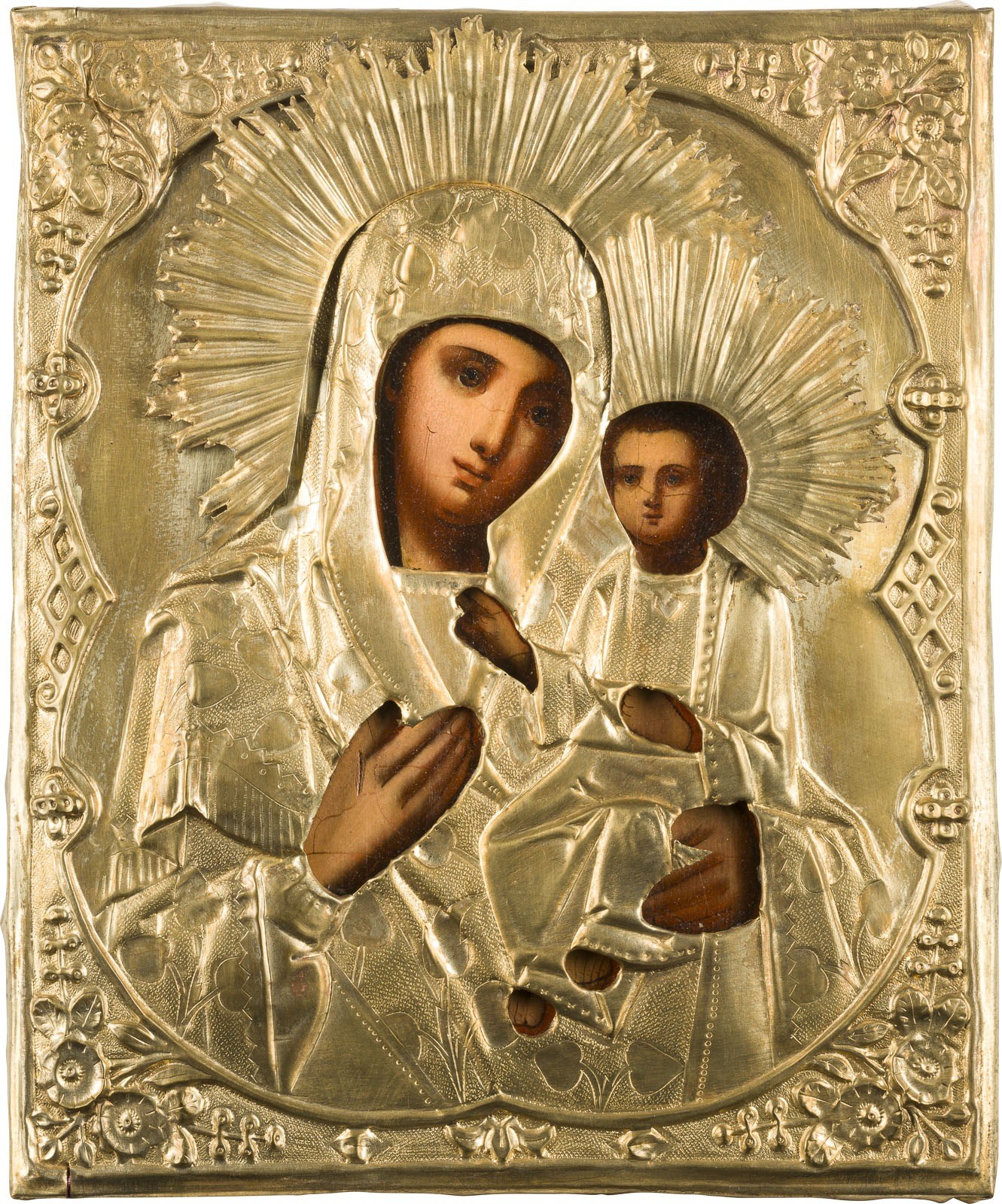 A SMALL ICON SHOWING THE IVERSKAYA MOTHER OF GOD WITH OKLAD Russian, 2nd half of the 19th century Oil on wood panel with fabric backing. Overlaid with a chased brass oklad. 27 x 22.5 cm.