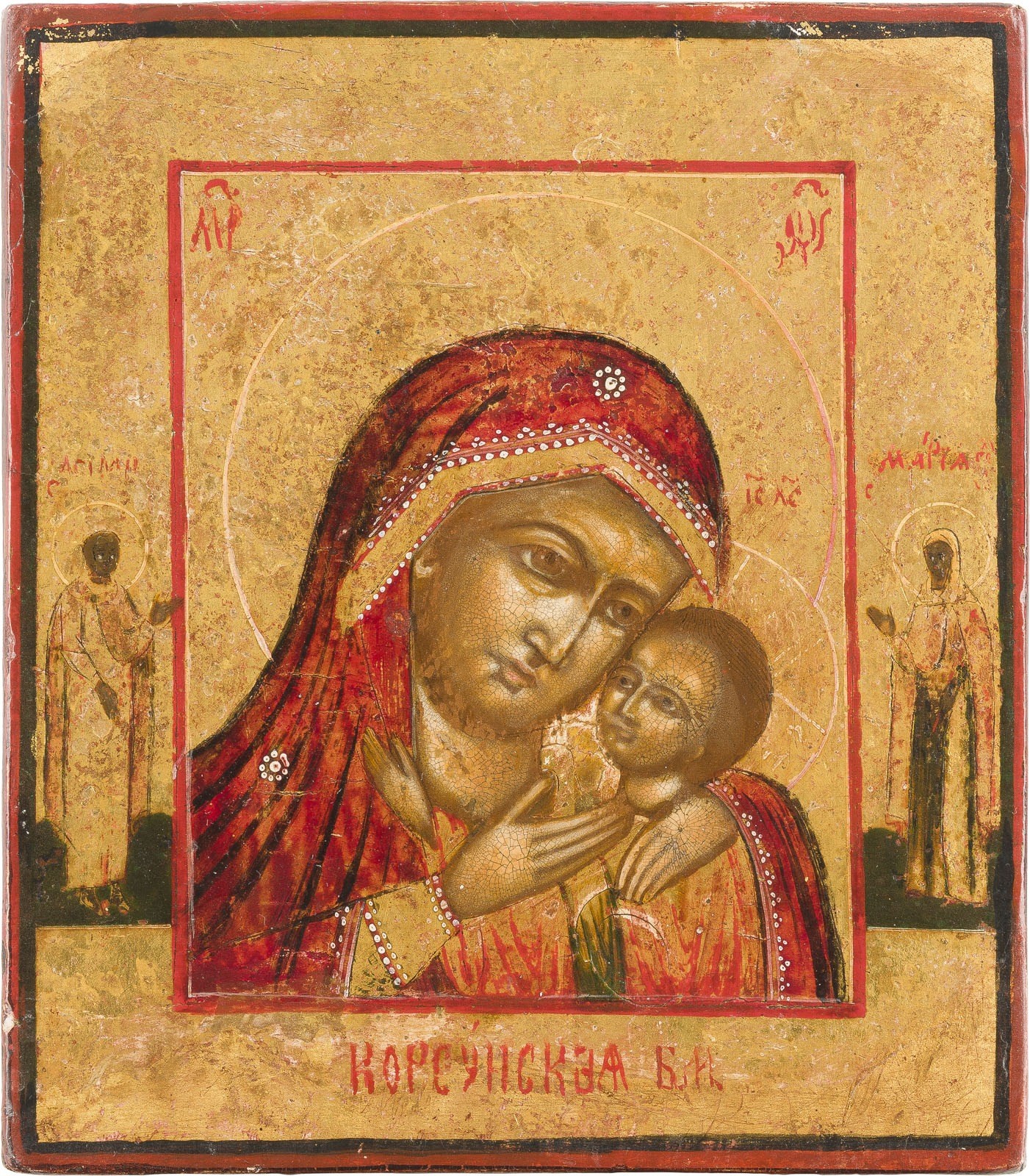 A SMALL ICON SHOWING THE KORSUNKSAYA MOTHER OF GOD Russian, Vetka, 19th century Tempera on wood panel. Executed on a gold ground. Two selected saints on the borders. Minimally restored. 13.1 x 11.5 cm.