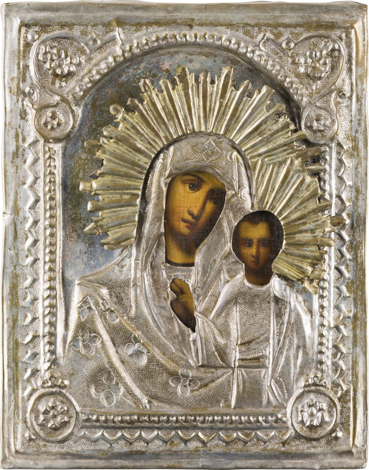A SMALL ICON SHOWING THE KAZANSKAYA MOTHER OF GOD WITH OKLAD Russian, 19th century Oil on wood panel with cloth backing. The brass oklad chased and repoussé. 22.4 x 17.7 cm.