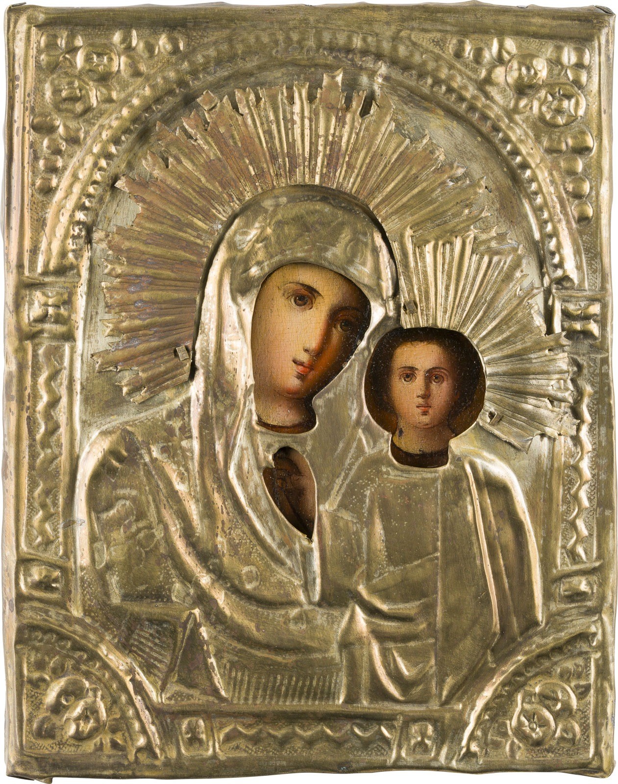 A SMALL ICON SHOWING THE KAZANSKAYA MOTHER OF GOD WITH OKLAD Russian, 19th century Oil on wood panel with velvet backing. The brass oklad chased and repoussé. 22.2 x 17.7 cm.