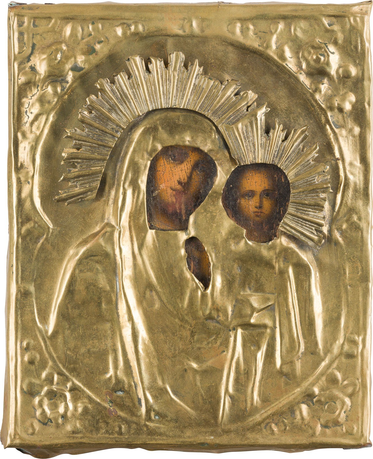 A SMALL ICON SHOWING THE KAZANSKAYA MOTHER OF GOD WITH OKLAD Russian, 19th century Oil on wood panel. The brass oklad chased and repoussé. Wearings. 17.5 x 14.3 cm.