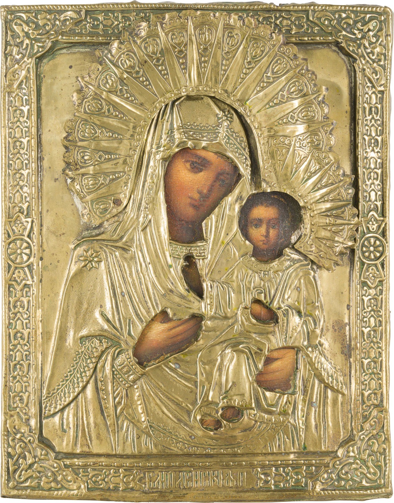 A SMALL ICON SHOWING THE SMOLENSKAYA MOTHER OF GOD WITH OKLAD Russian, late 19th century Oil on wood panel. Overlaid with a brass oklad. Minor losses. 22.2 x 17.5 cm.