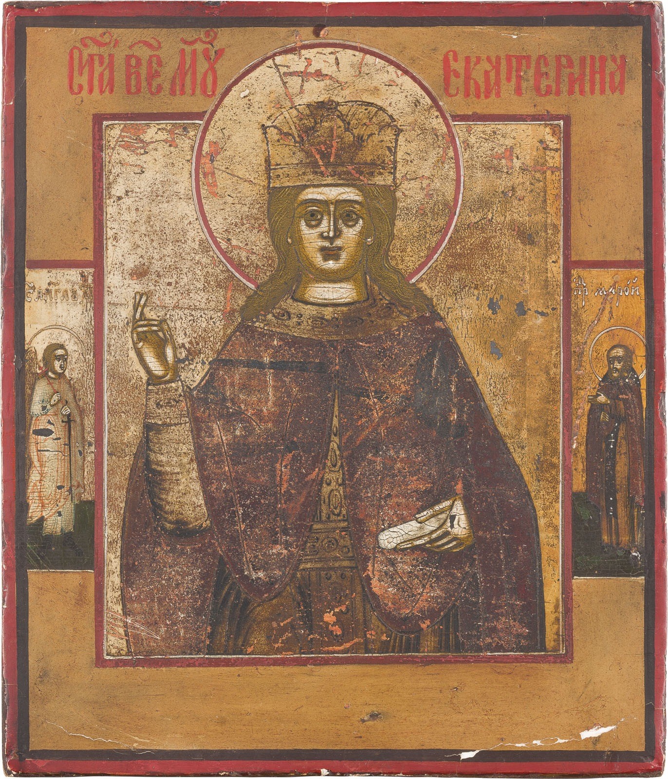 A SMALL ICON SHOWING ST. CATHERINE Russian, Old Believers' Workshop, 19th century Tempera on wood panel. The background made of silver, covered by a golden lacquer. Two selected saints on the borders: Guardian Angel and St. Maron. Minor losses. 17.3 x 14.8 cm.