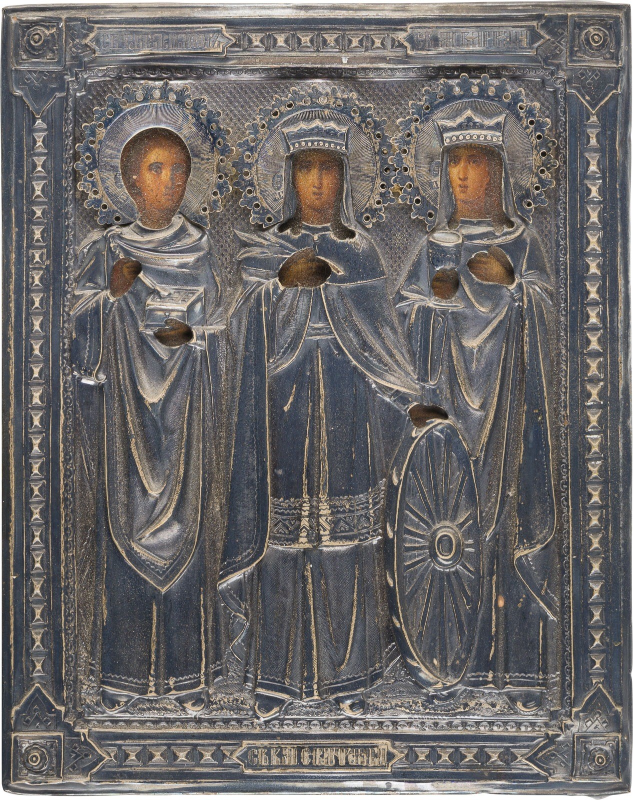 A SMALL ICON SHOWING ST. CATHERINE FLANKED BY STS. PANTELEIMON AND BARBARA WITH SILVER OKLAD Russian, late 19th century (icon), Russian, Moscow, 1891 (oklad) Oil on wood panel with velvet backing. The silver oklad finely chased and repoussé with geometric patterns. Marked with city hallmark, assayer's mark, 84 standard and master's mark 'M.M.'. 22.1 x 17.7 cm.