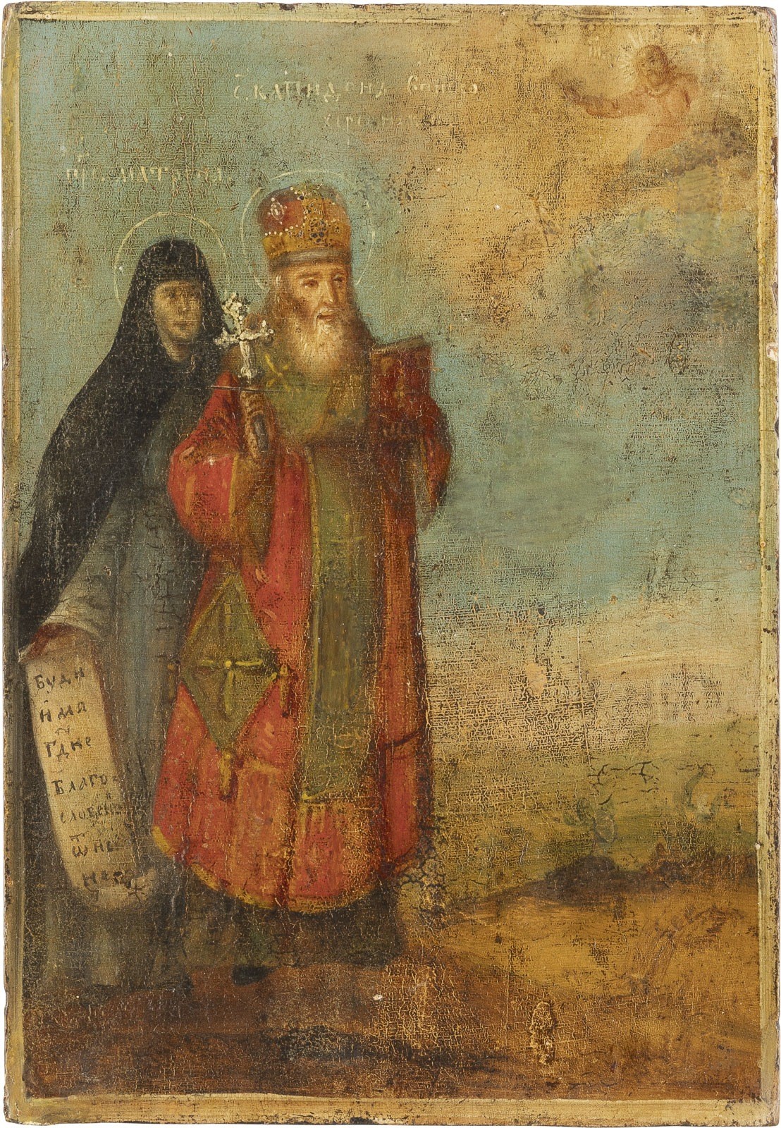 A SMALL ICON SHOWING ST. MATRONA AND A BISHOP SAINT Russian, 1st half 19th century Oil on wood panel. Minimally worn, minimally restored. 22 x 15.4 cm.