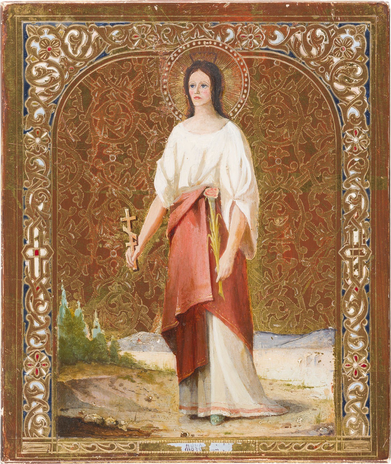 A SMALL ICON SHOWING A FEMALE MARTYR SAINT Russian, circa 1900 Oil on wood panel. The gilt background ornately incised. The borders ornately incised and painted in faux enameling. Restorations. 17.7 x 14.8 cm.