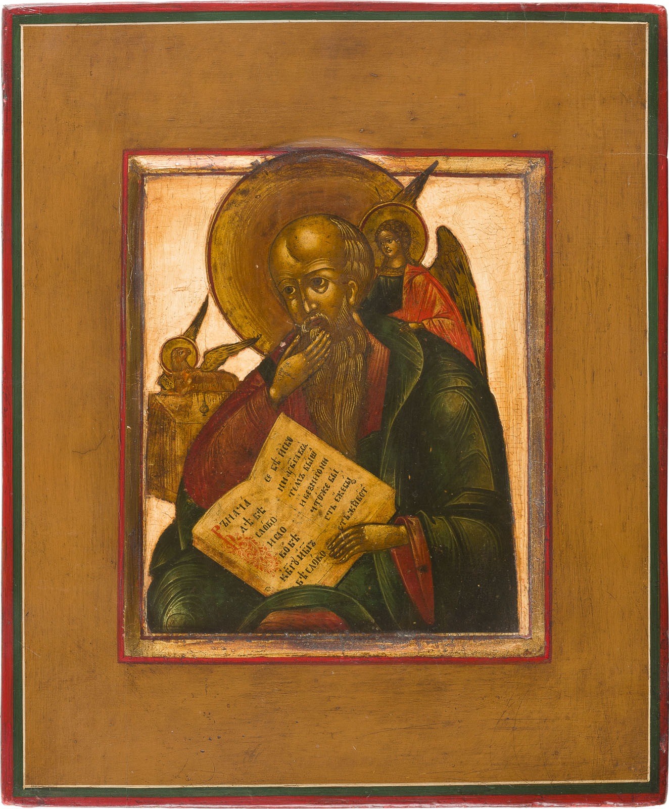 A SMALL ICON SHOWING ST. JOHN THEOLOGIAN IN SILENCE Russian, 19th century Tempera on wood panel with kovcheg. Inserted into a later panel, the background stripped to gesso, restored. 28 x 23.3 cm.