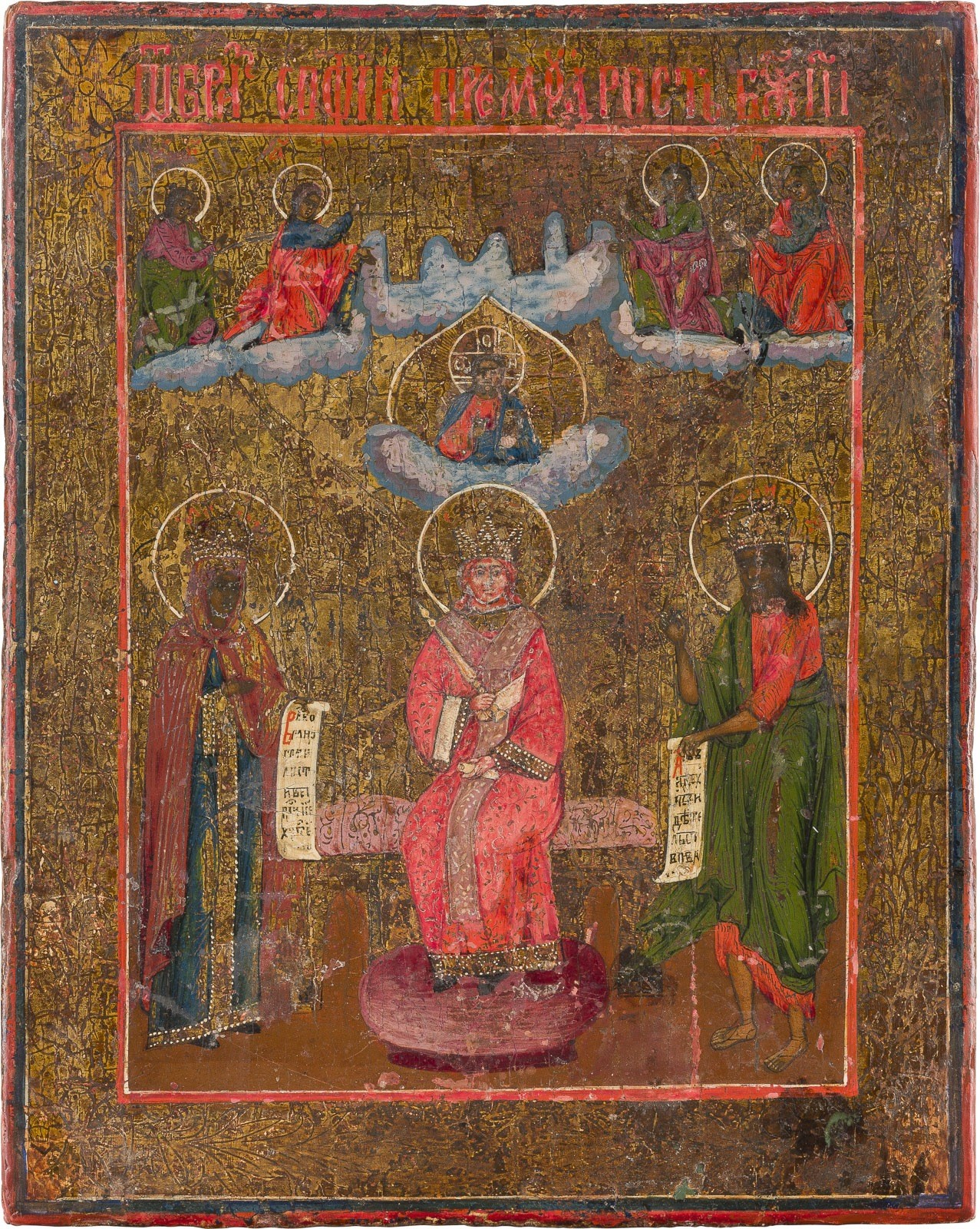 A SMALL ICON SHOWING SOPHIA, THE WISDOM OF GOD Russian, 19th century Tempera on wood panel. The background made of silver, covered by a golden lacquer. Restored. 21.9 x 17.5 cm.