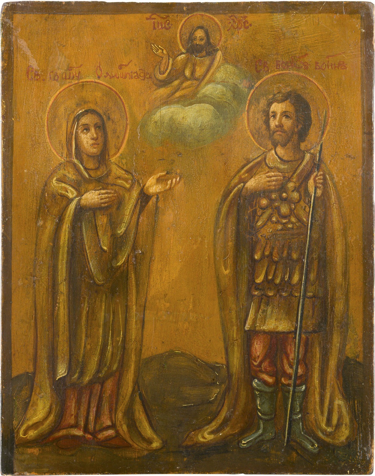 A SMALL ICON SHOWING TWO FAMILY PATRON SAINTS Russian, circa 1900 Oil on wood panel. Minimally restored. 20.8 x 16.2 cm.