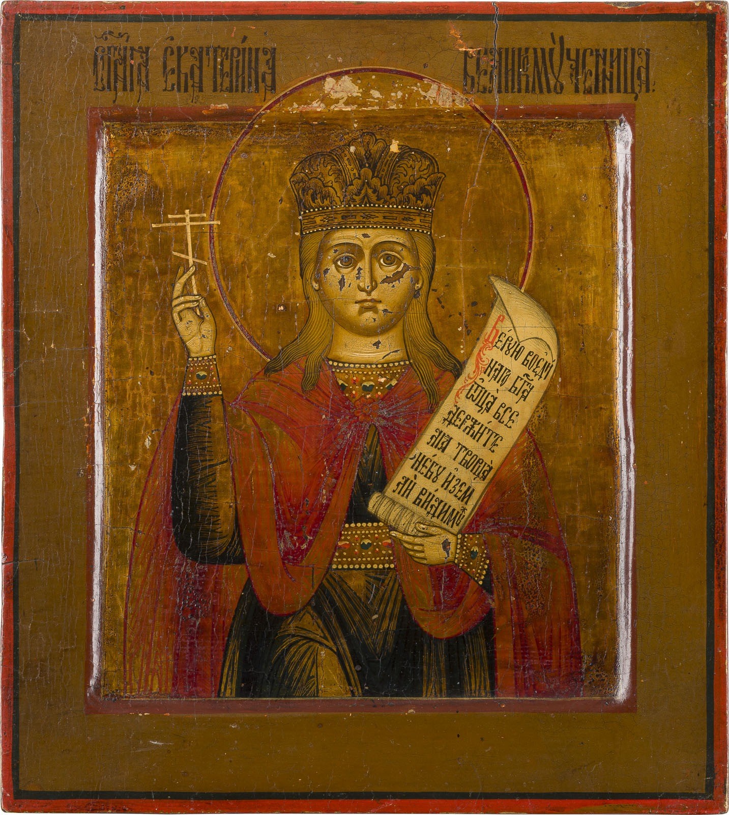 A SMALL ICON SHOWING ST. CATHERINE Russian, circa 1800 Tempera on wood panel with kovcheg. The background made of silver, covered by a golden lacquer. Minor losses. 26.4 x 24 cm.