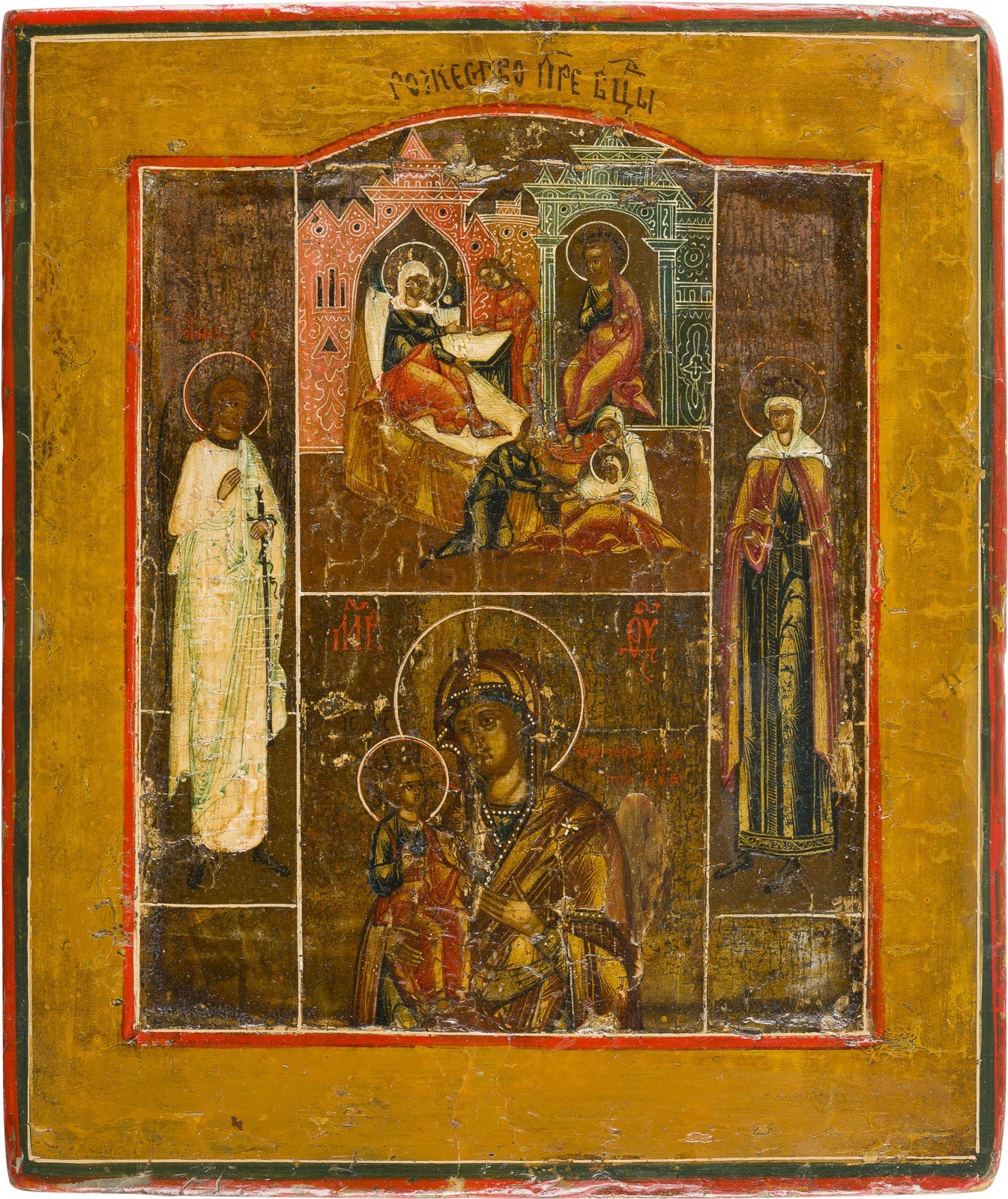 KLEINFORMATIGE IKONE MIT DER GEBURT DER GOTTESMUTTER, DER DREIHÄNDIGEN GOTTESMUTTER UND HEILIGEN