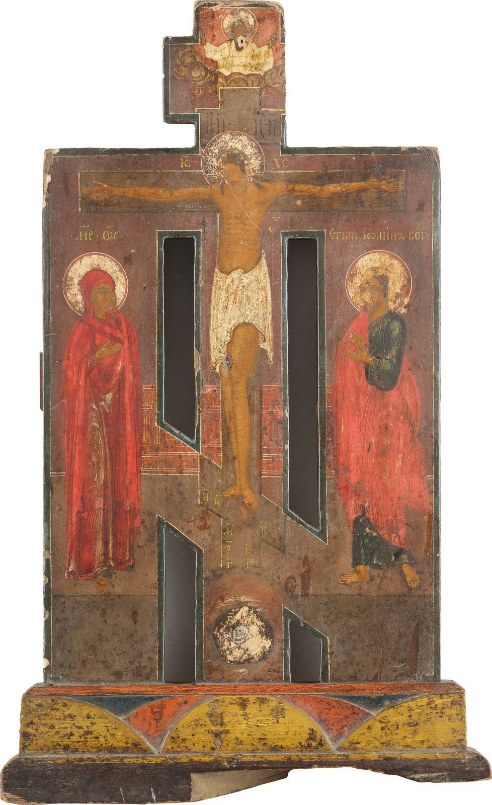 A CRUCIFIX Russian, 19th century Tempera on wood. Wearings, damages to the base. 42.3 x 26 cm.