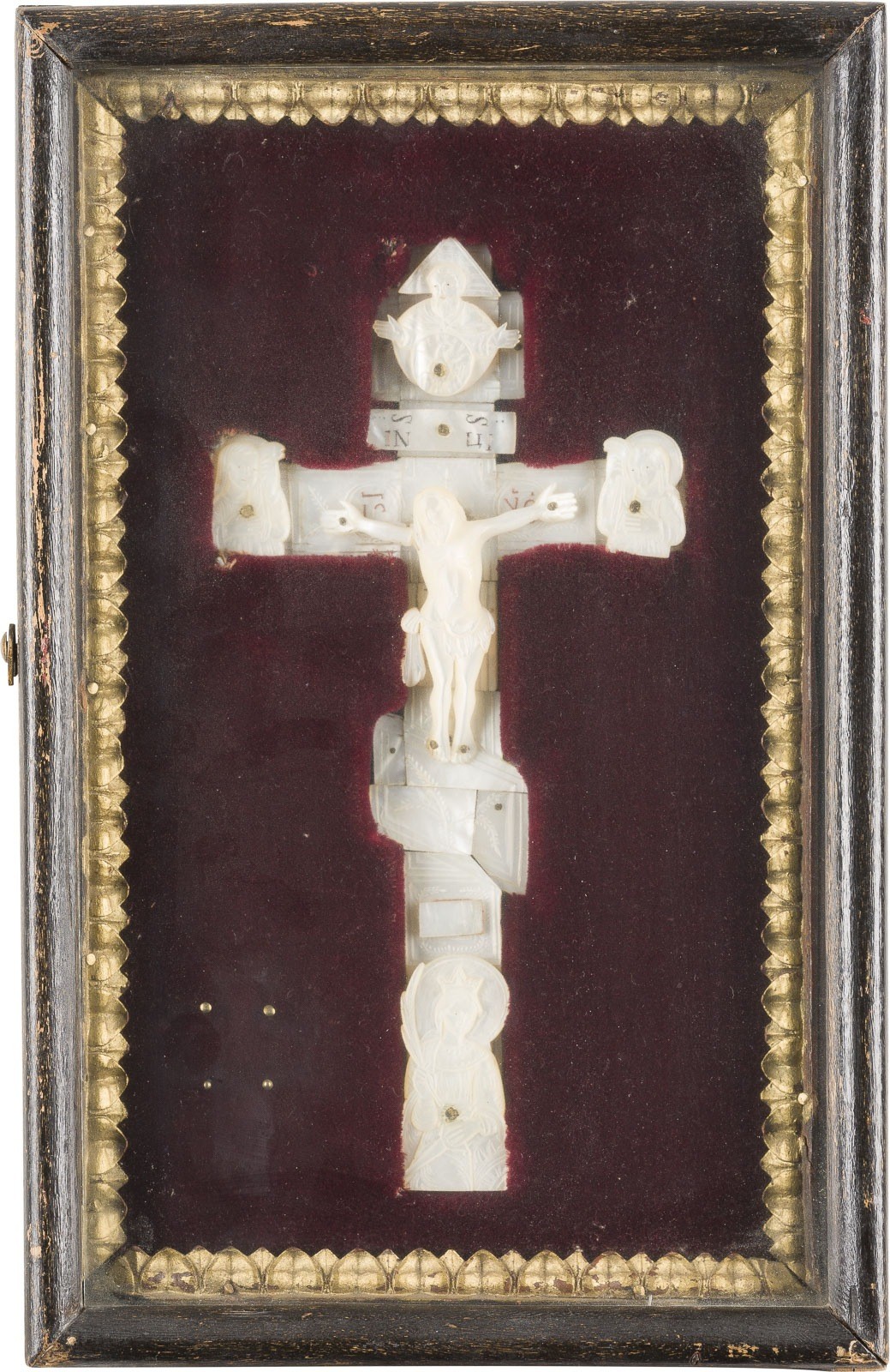 A MOTHER-OF-PEARL CRUCIFIX SHOWING THE CRUCIFIXION AND ST. CATHERINE WITHIN KYOT Jerusalem, 19th century Carved and incised. Minimally damaged. 32.8 x 21 cm (with glazed kyot).