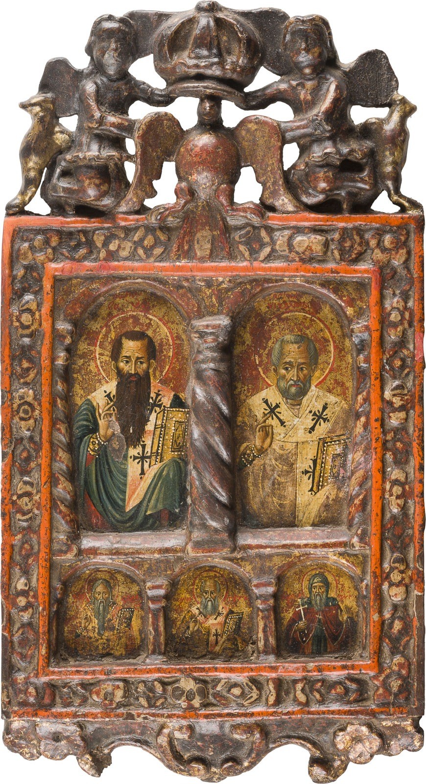 A MULTI-PARTITE ICON WITH EPISCOPAL SAINTS Greek, Ionian Islands, circa 1680 Tempera on wood panel, gold ground, with an ornamental carved border and figural finial. Depicting Saints Basil of Cappadocia, Nicholas of Myra, Haralambos, Athanasius, and Anthony the Great. Minor paint losses. 41 × 21.7 cm.