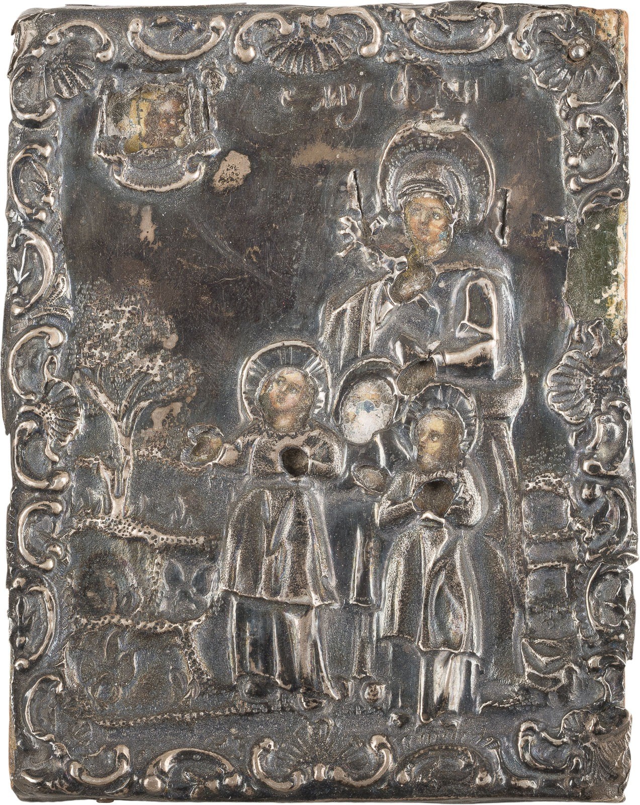 A MINIATURE ICON DEPICTING ST. SOPHIA AND HER DAUGHTERS FAITH, LOVE AND HOPE WITH SILVER OKLAD Russian, mid 19th century (icon), Russian, St. Petersburg, 1842 (oklad) Tempera on wood panel. The silver oklad chased and repoussé with scrolls. Marked with city hallmark, assayer's mark, 84 standard and master's mark. Damages to the edge. 11 x 8.8 cm.